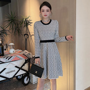 Fendi FF Logo Long Sleeve Jacquard Round Collar Gray Fabric Dress