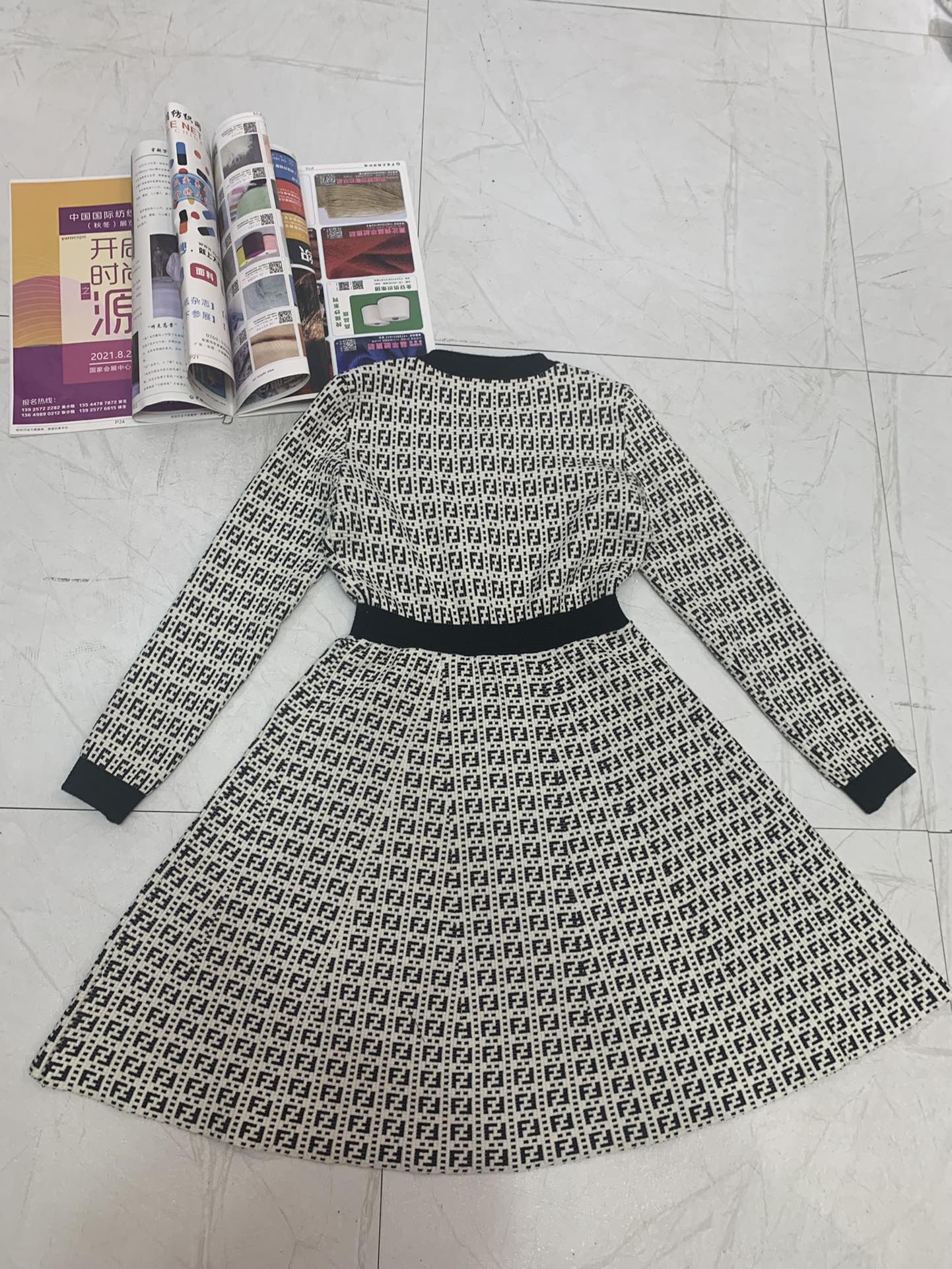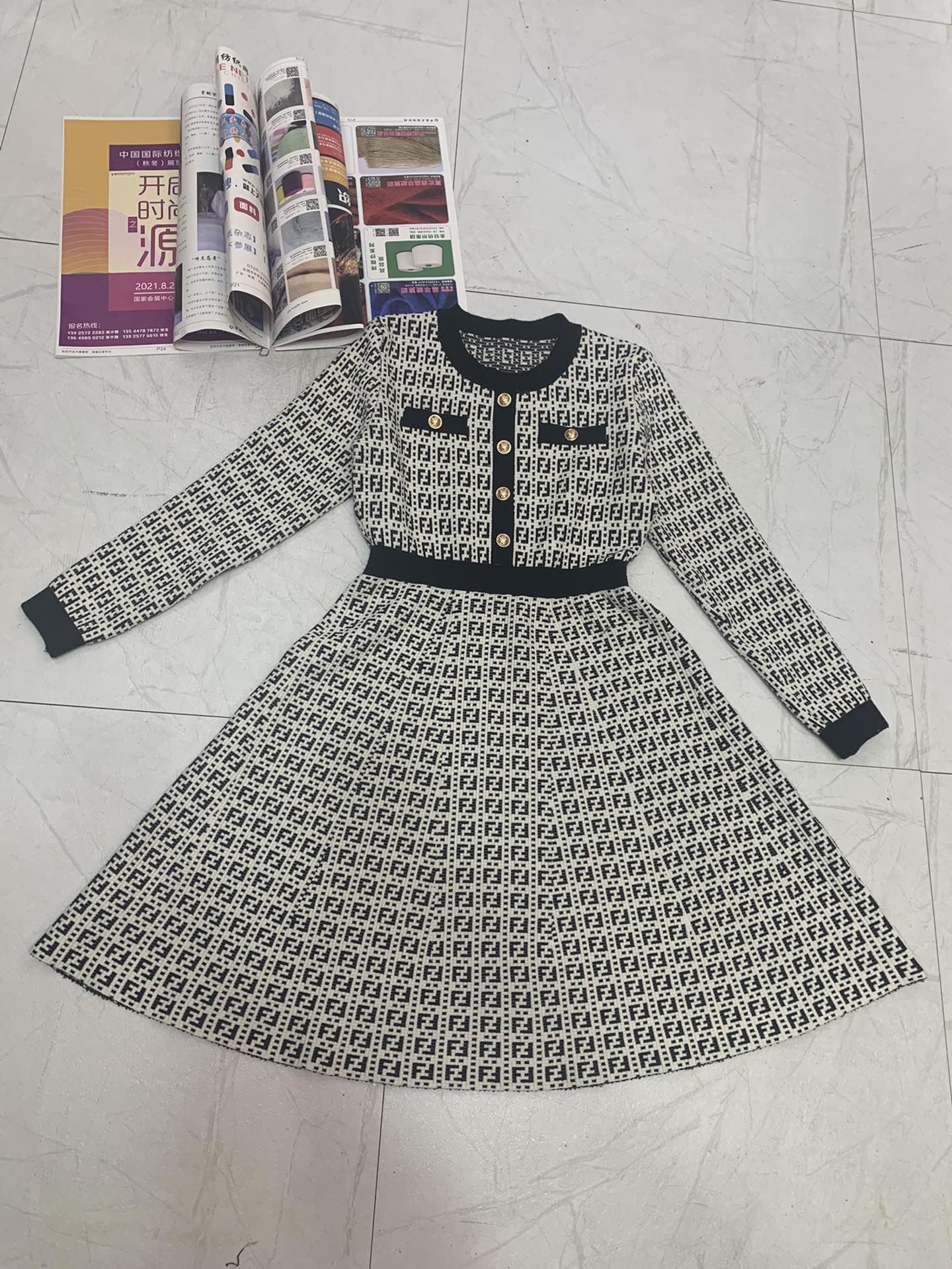 Fendi FF Logo Long Sleeve Jacquard Button Black White Fabric Wool Dress