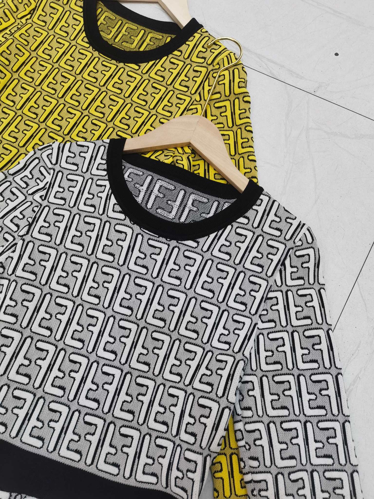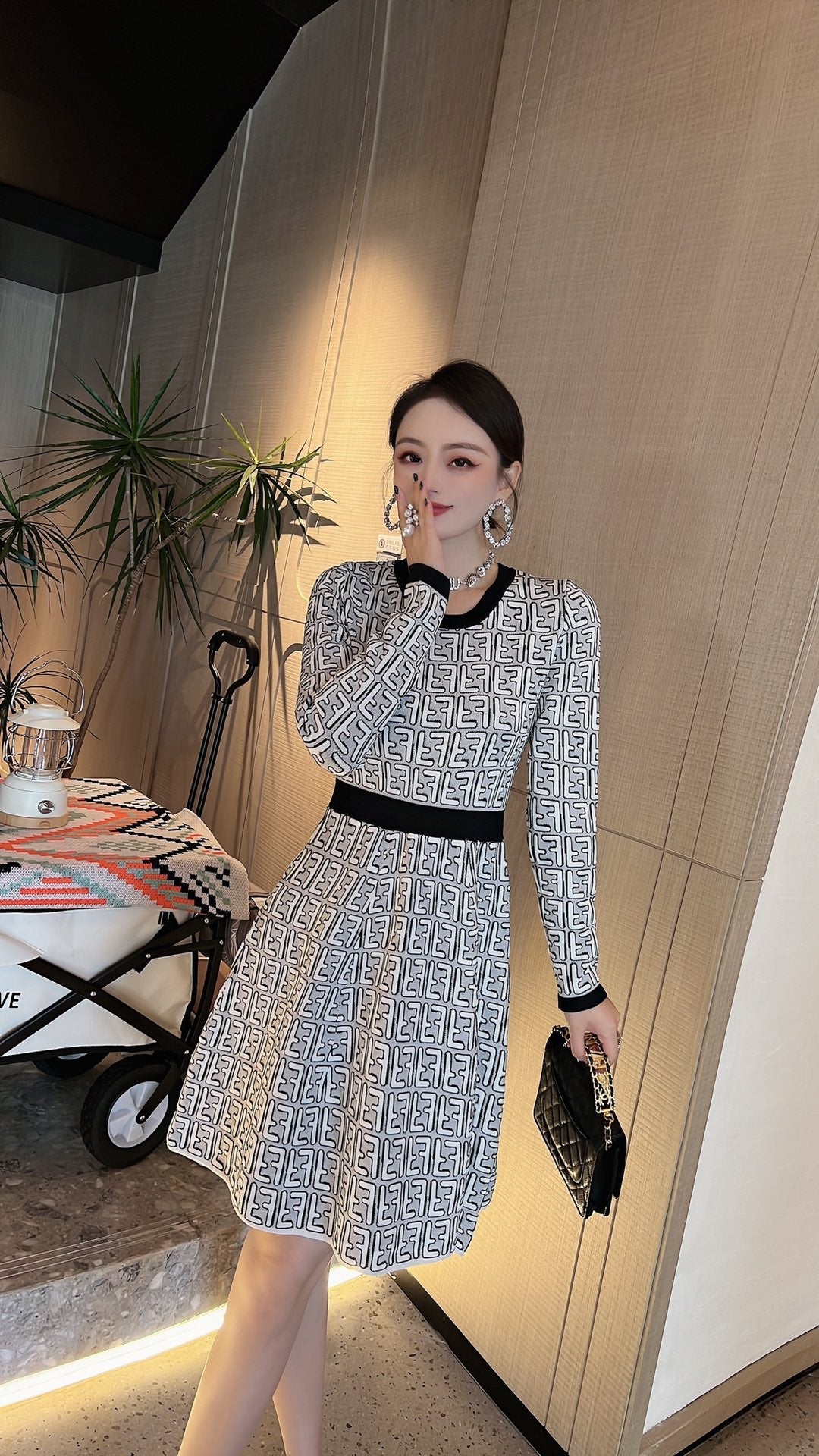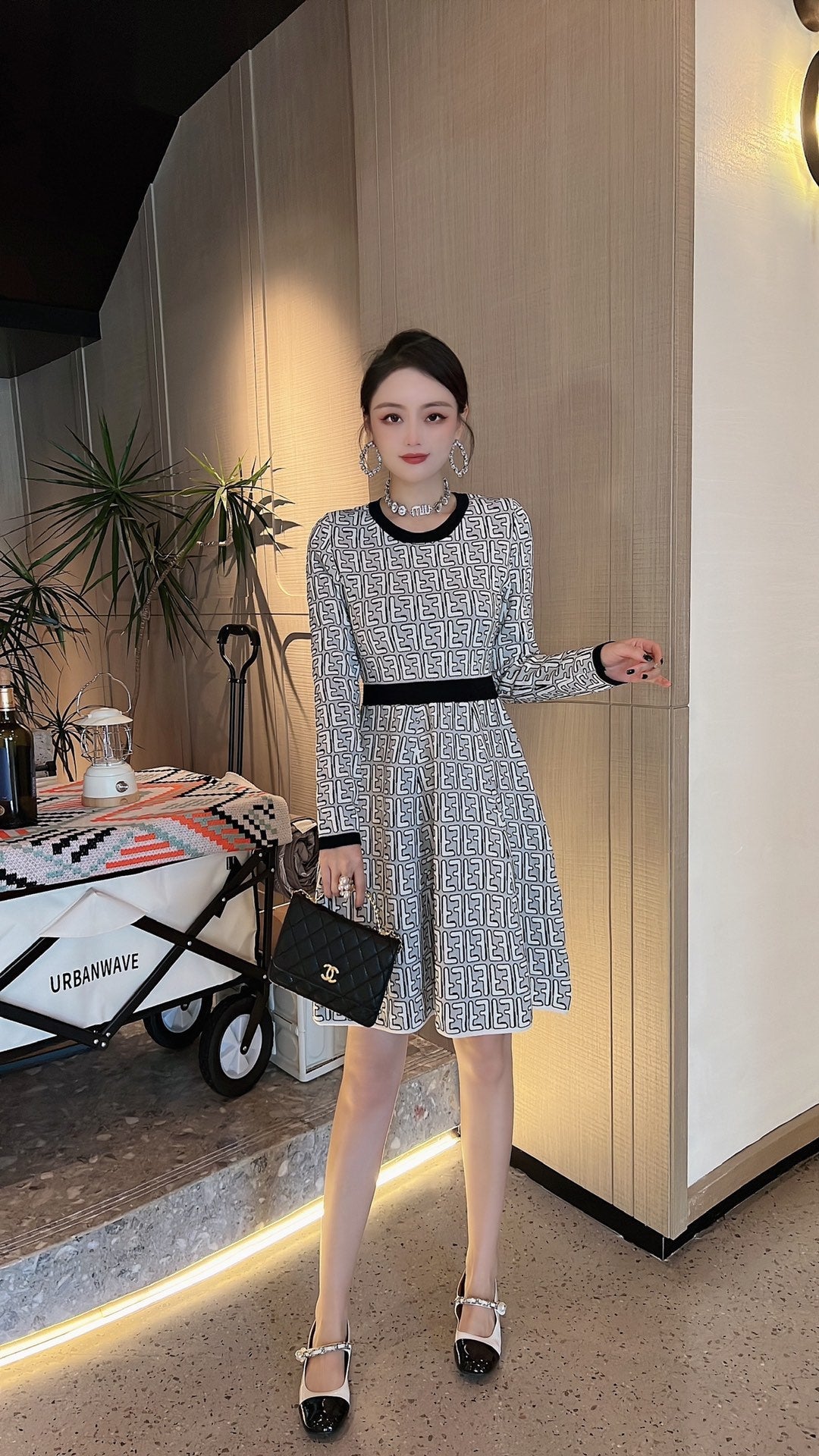 Fendi FF Logo Long Sleeve Jacquard Round Collar Gray Fabric Dress