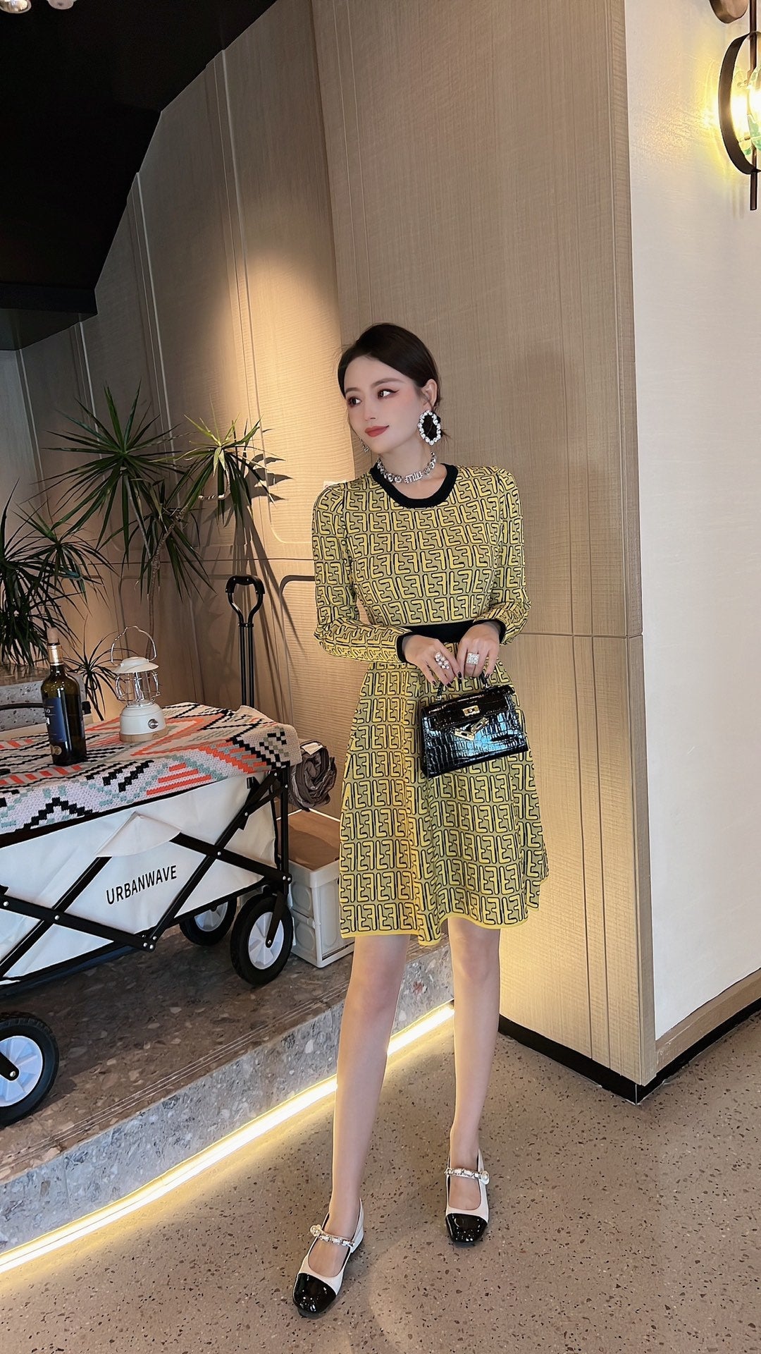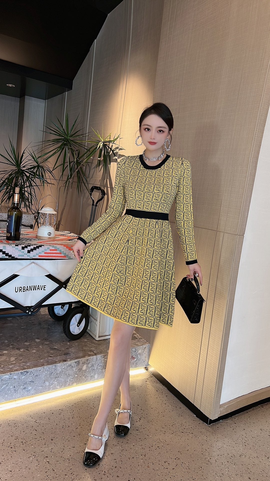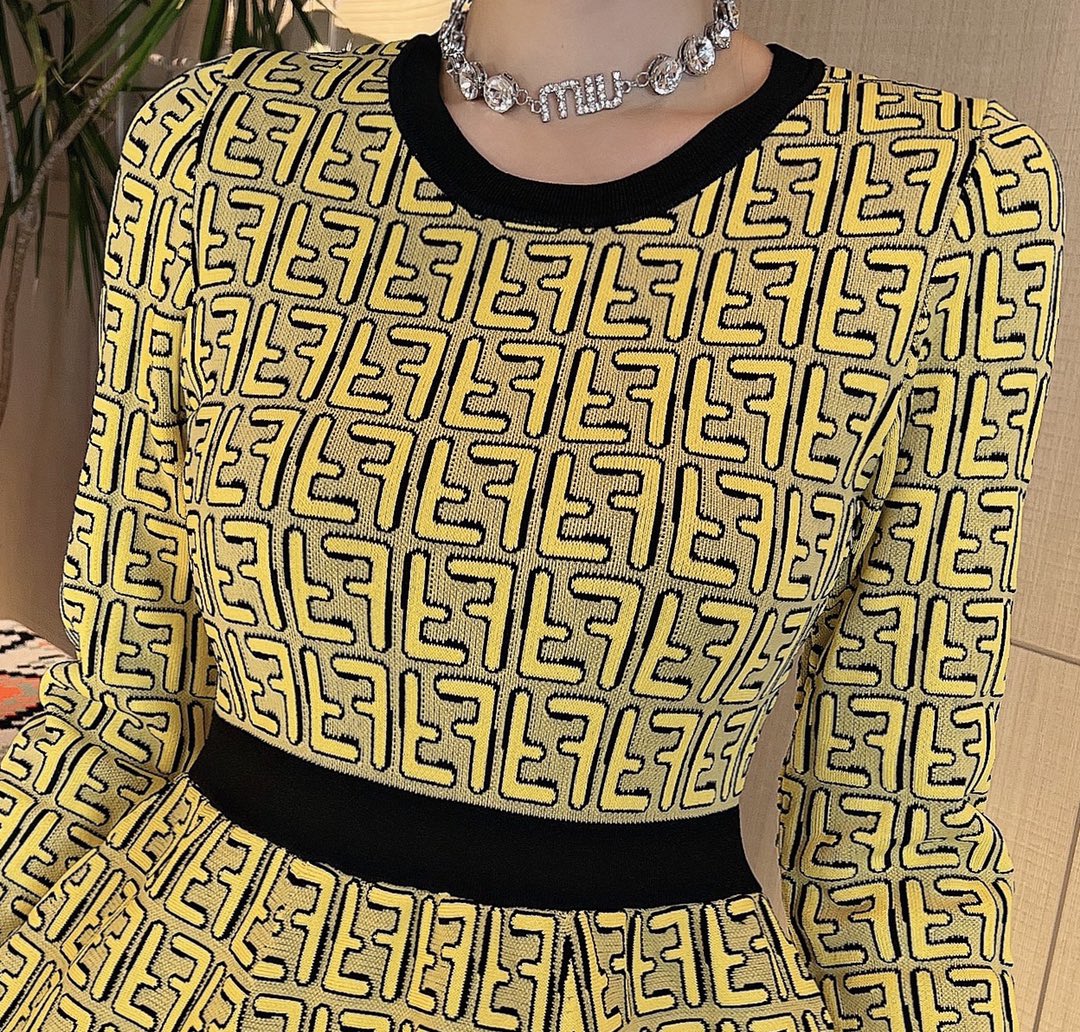 Fendi FF Logo Long Sleeve Jacquard Round Collar Yellow Fabric Dress