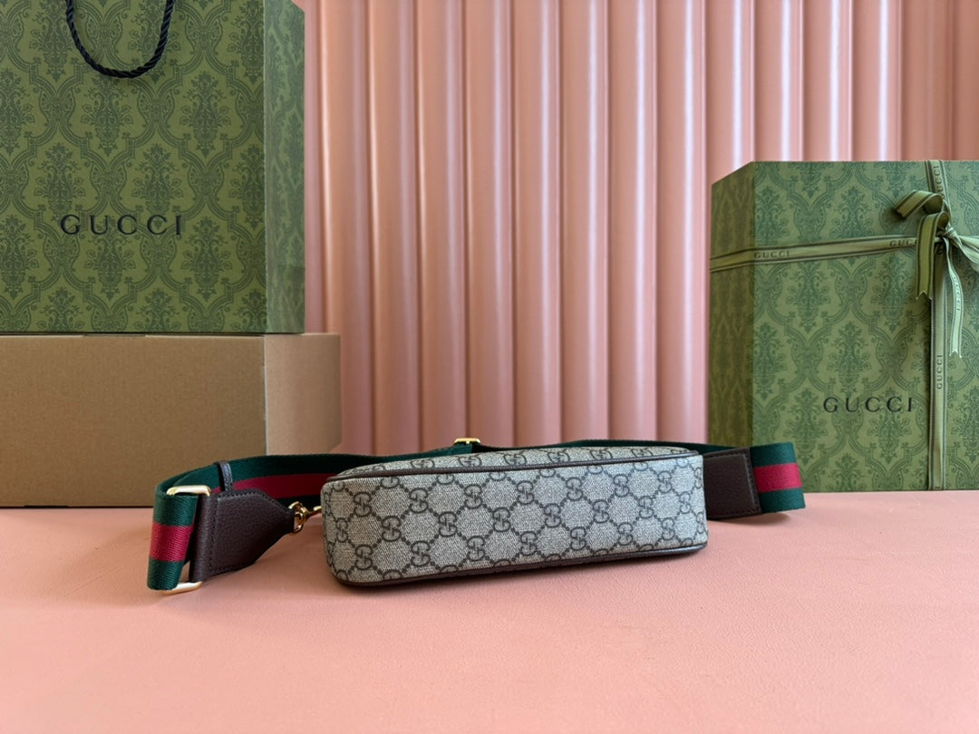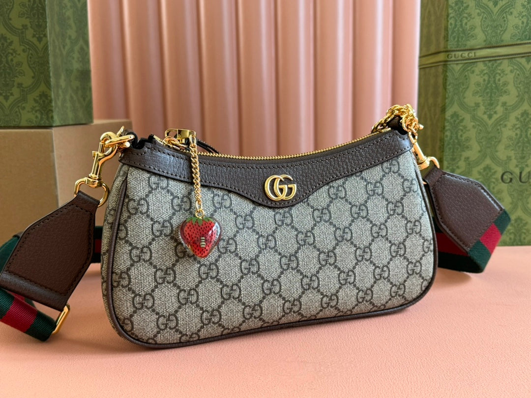 OPHIDIA SMALL SHOULDER BAG 25 IN BEIGE EBONY CANVAS AND DARK BROWN LAMBSKIN GOLD HARDWARE