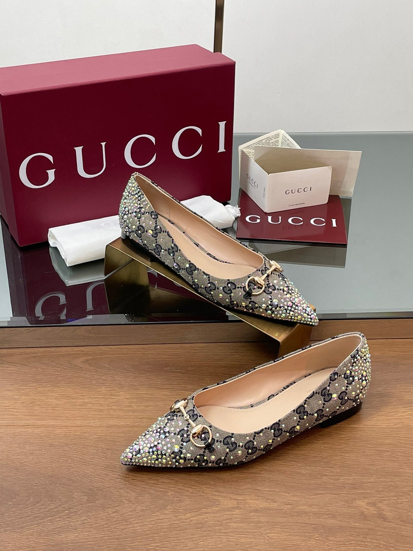 GG Horsebit Ballet Flat Beige Black Monogram Canvas Crystal-Embellished