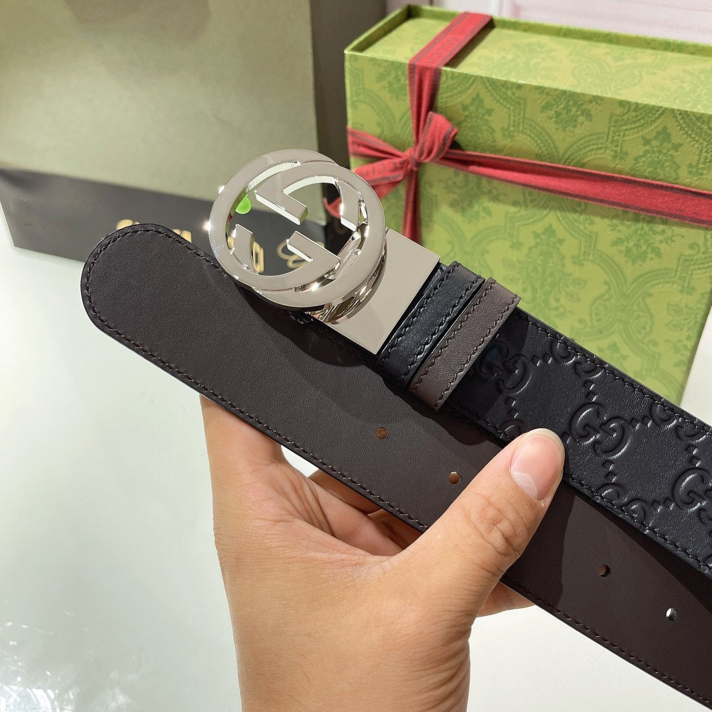 INTERLOCKING G SILVER BUCKLE 37MM BLACK BROWN LEATHER