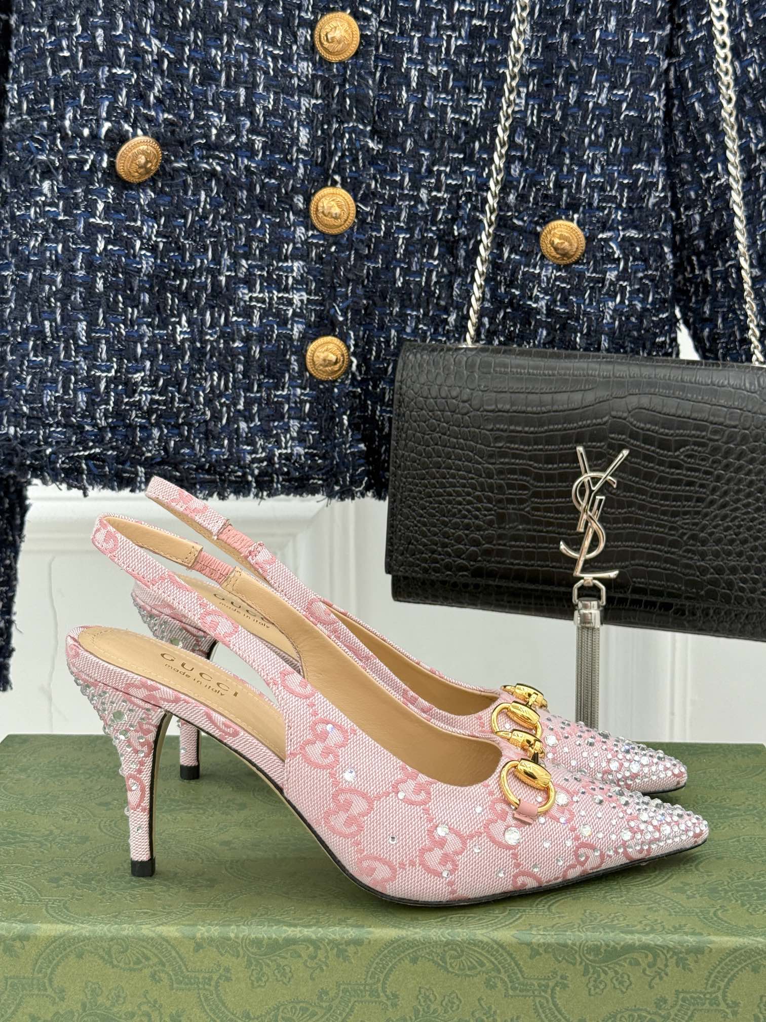 GG Horsebit Slingback 100MM Beige Pink Monogram Canvas Point Toe Crystal-Embellished