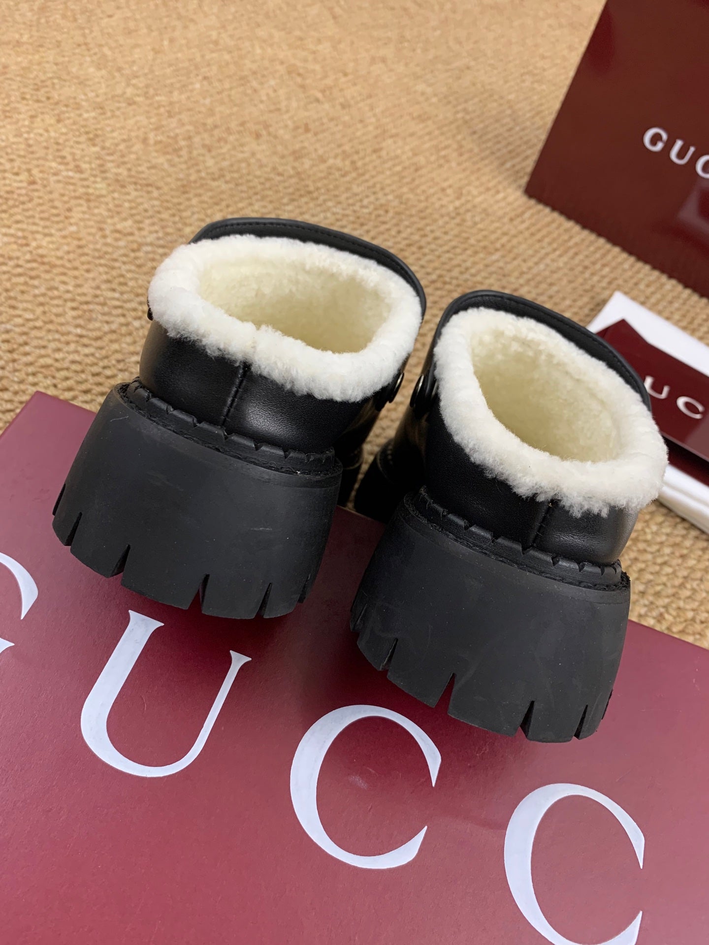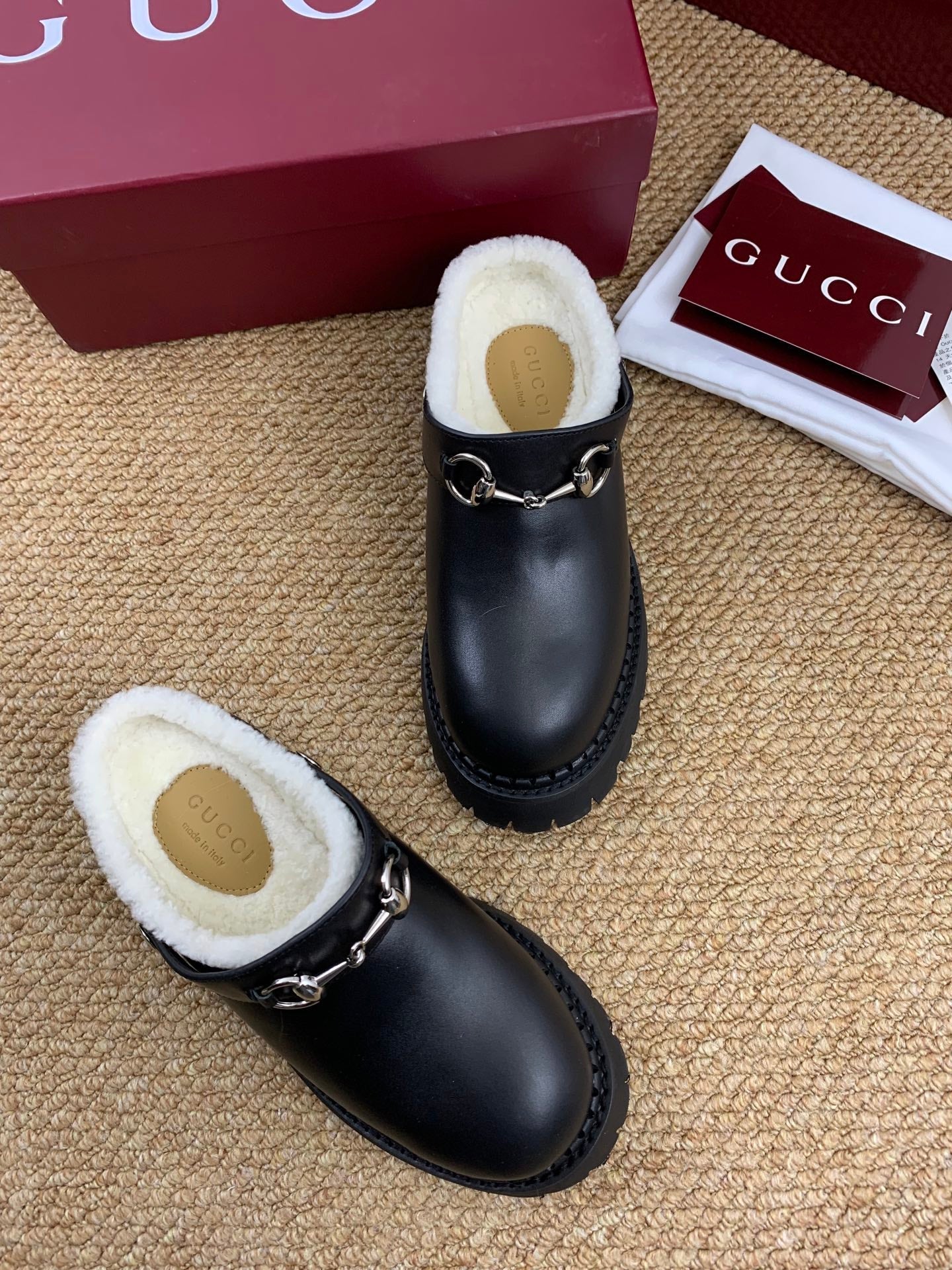 Gucci FW 25 Horsebit Suede Clog Black Leather with Shearling 506443
