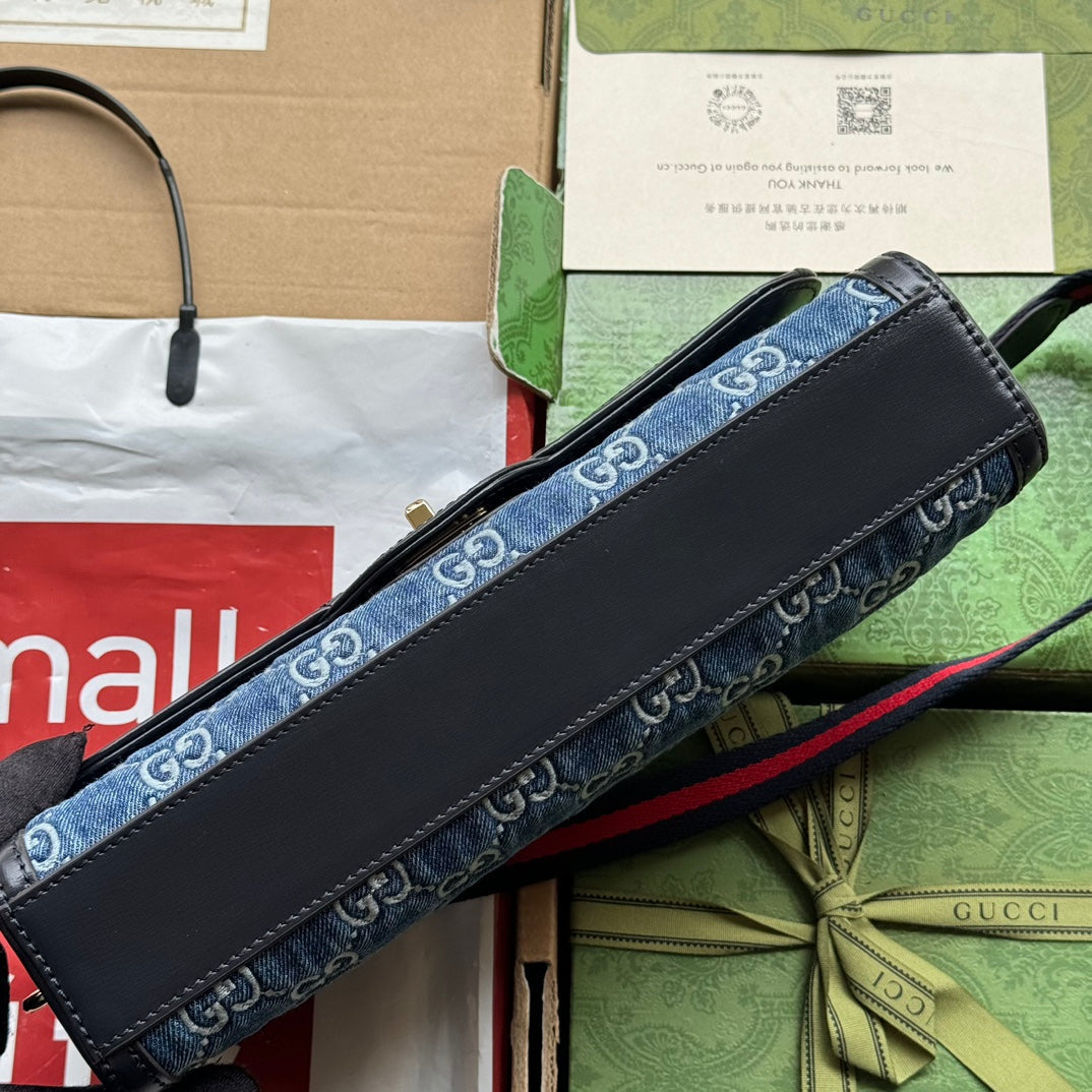 LUCE SMALL SHOULDER BAG 27 IN BLUE EMBOSSED DENIM AND BLACK CALFSKIN TRIM GOLD HARDWARE