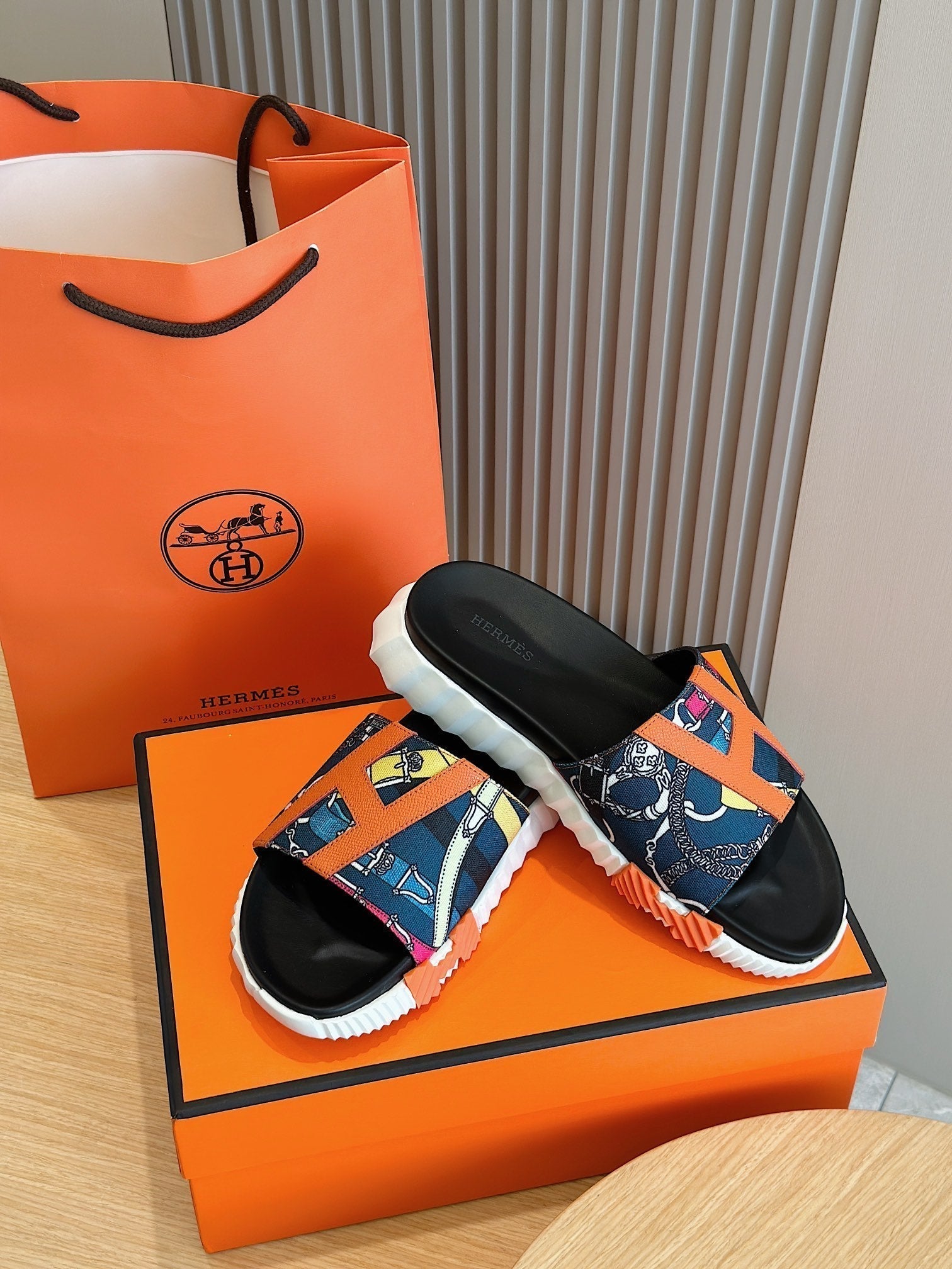 HM SLIPPERS BLACK AND NAVY CANVAS WITH MOTIF
