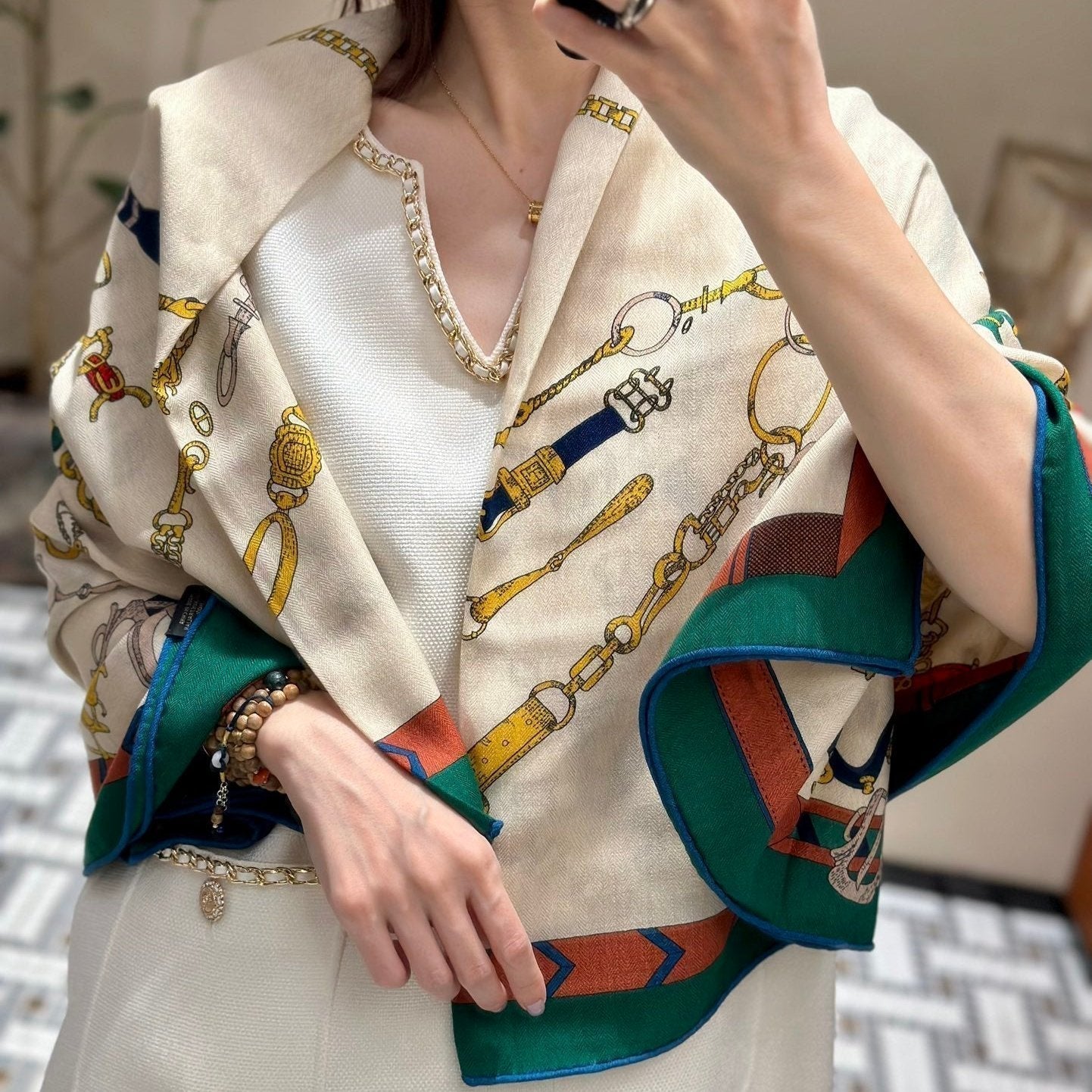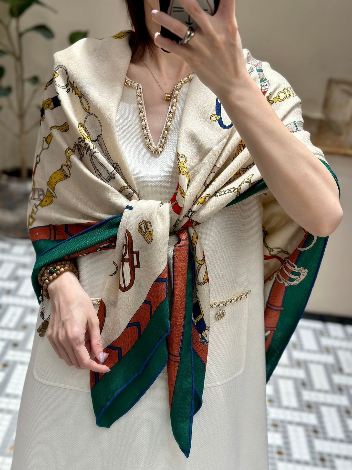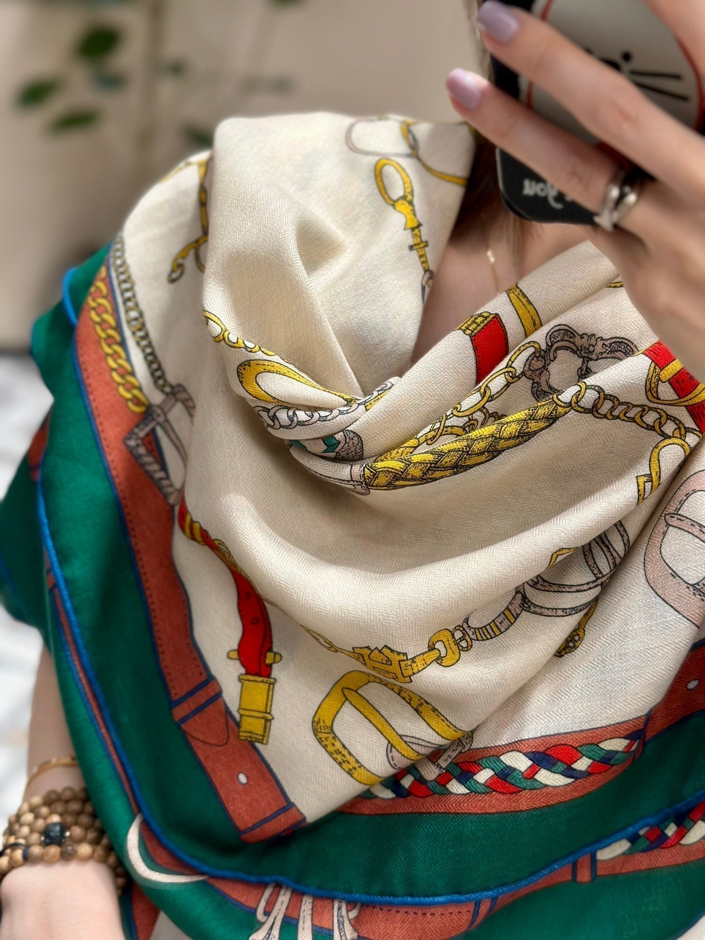 Chevaux Dechaines Shawl 135 CM IN Green Colorful Cashmere Silk 373684