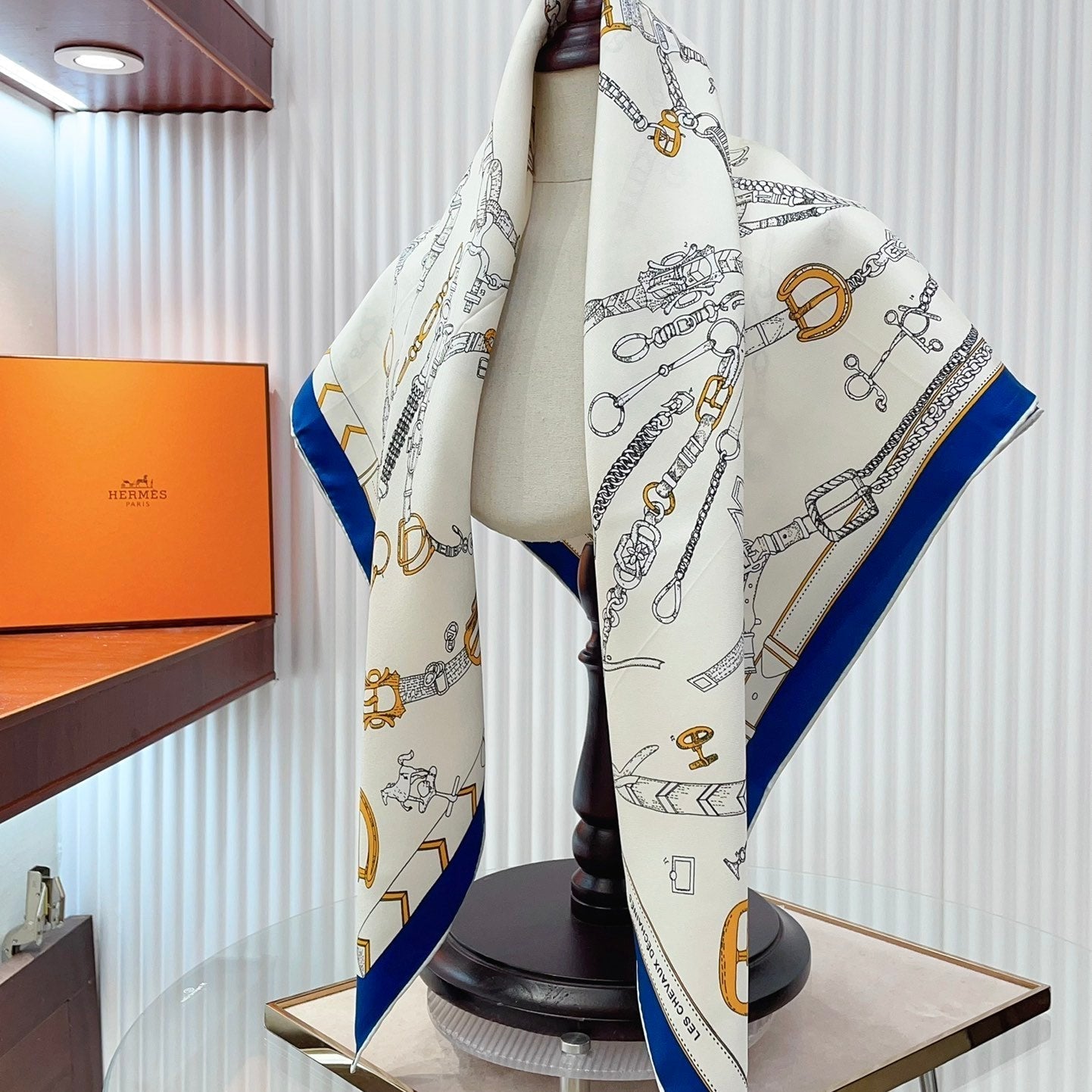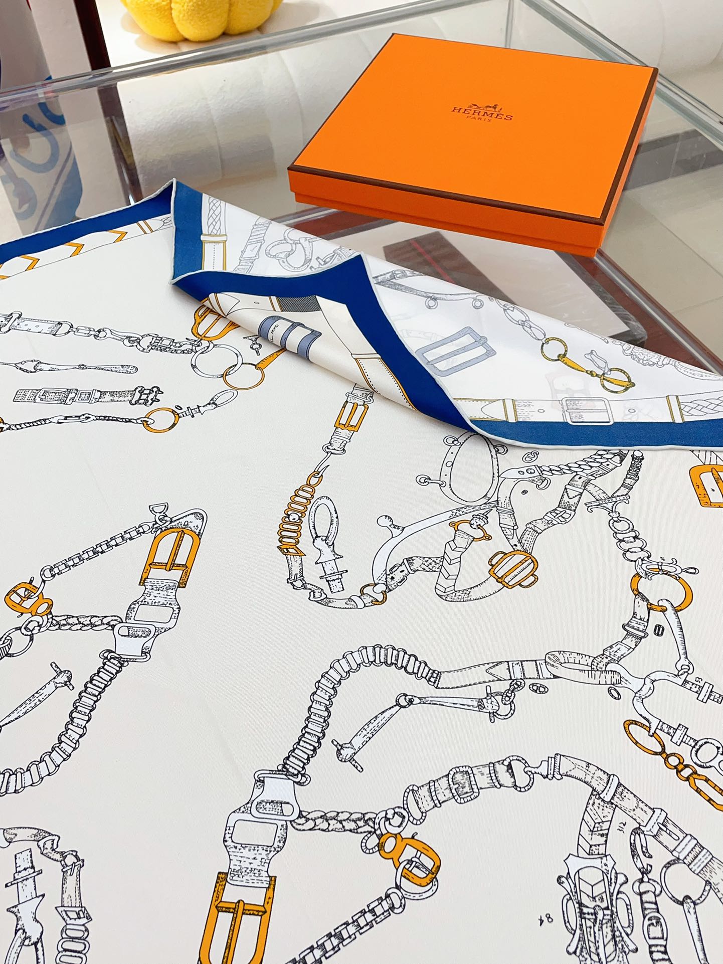 Chevaux Dechaines Shawl 90 CM In White Blue Colorful Silk Twill 201033