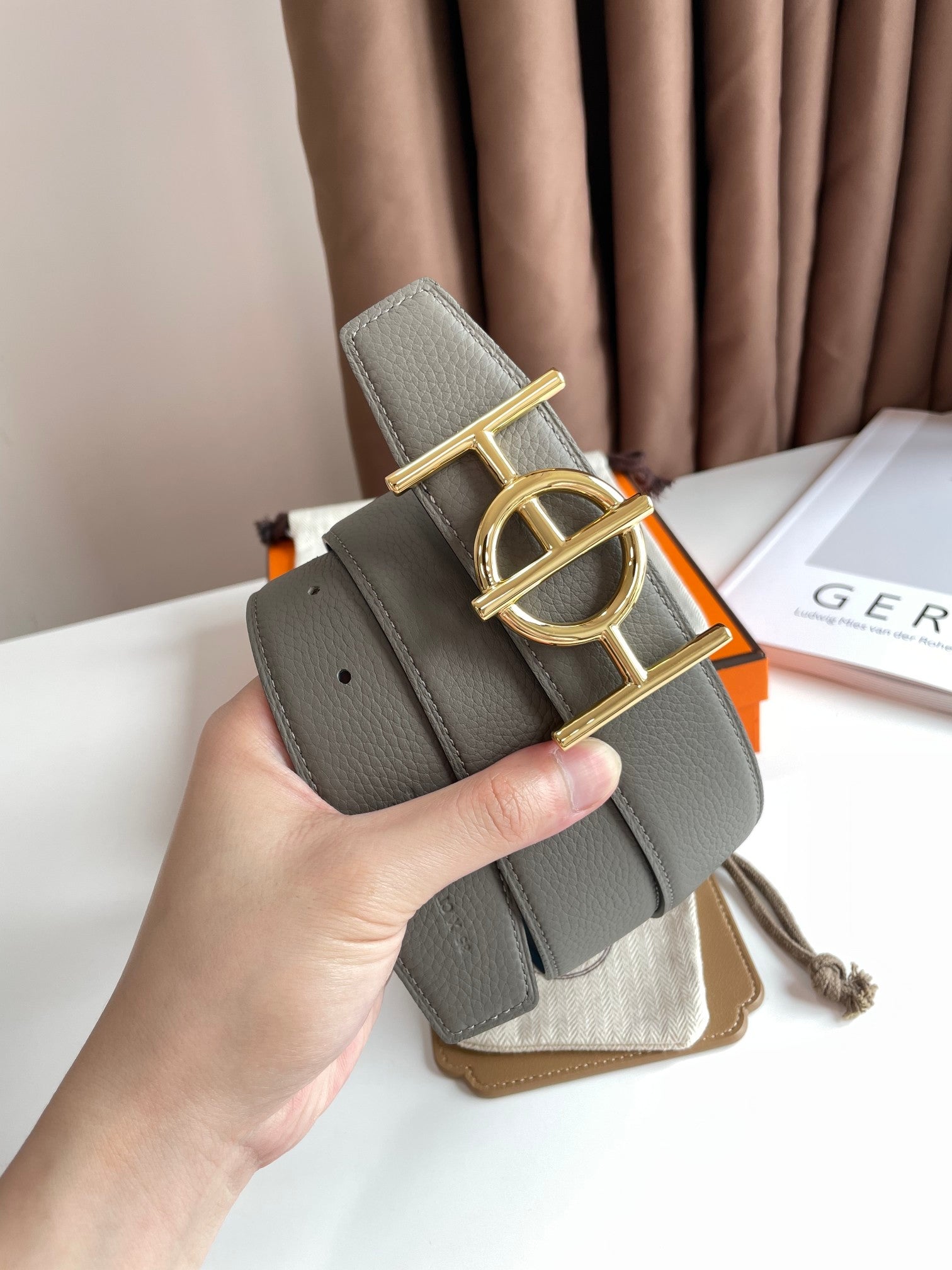 H ULYSSE BELT 38MM GOLD BUCKLE BLUE GREY LEATHER