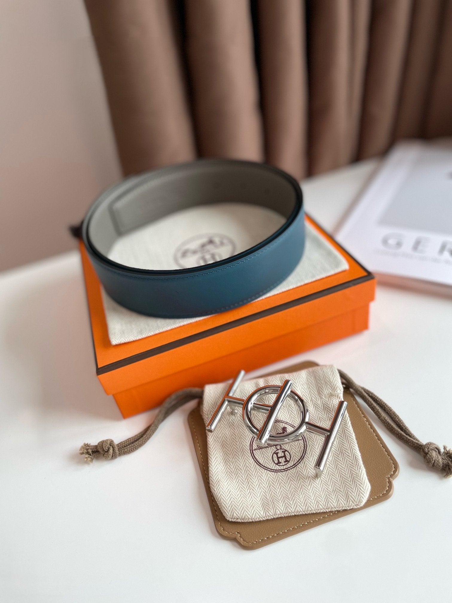 H ULYSSE BELT 38MM SILVER BUCKLE BLUE GREY LEATHER