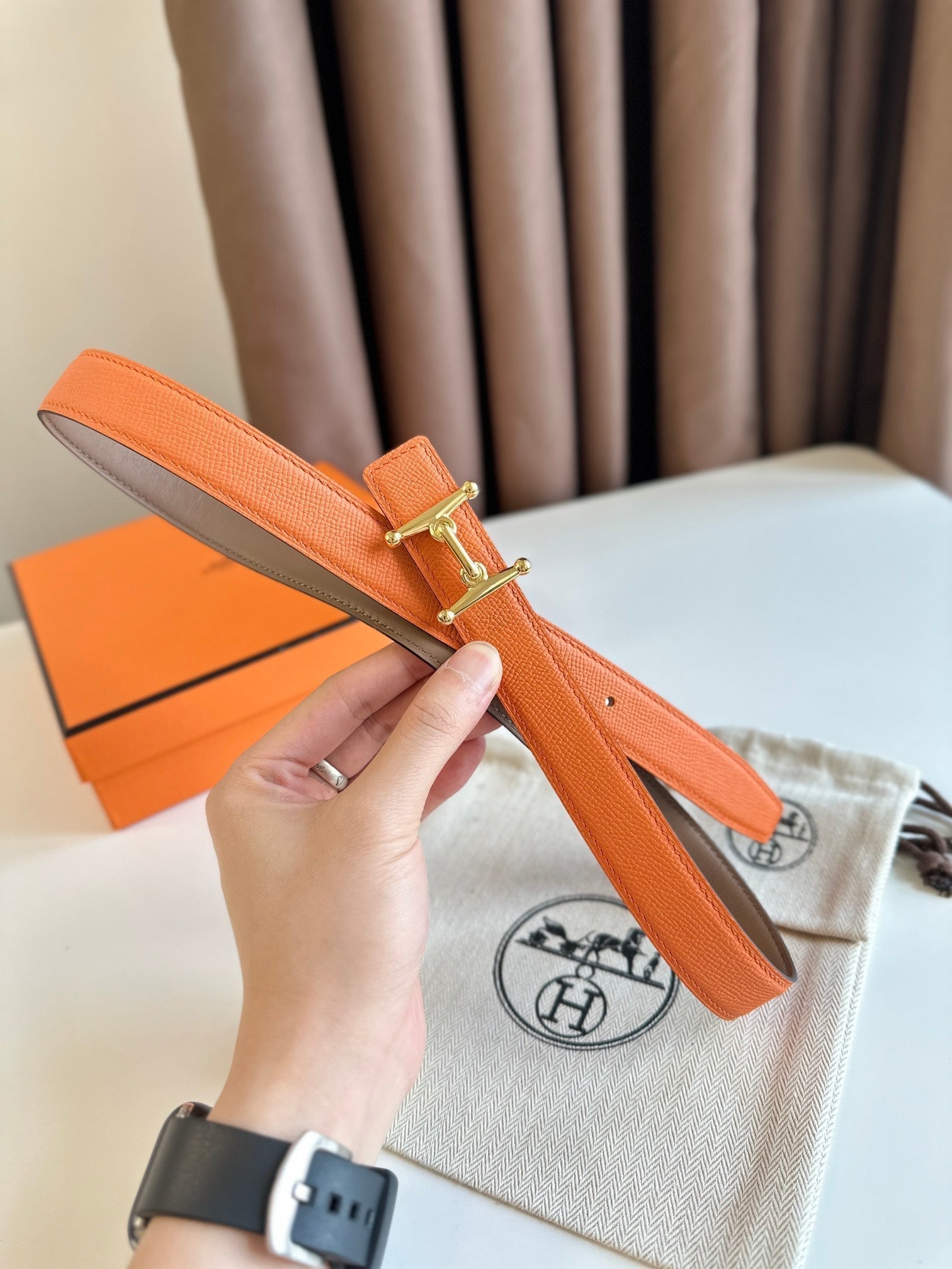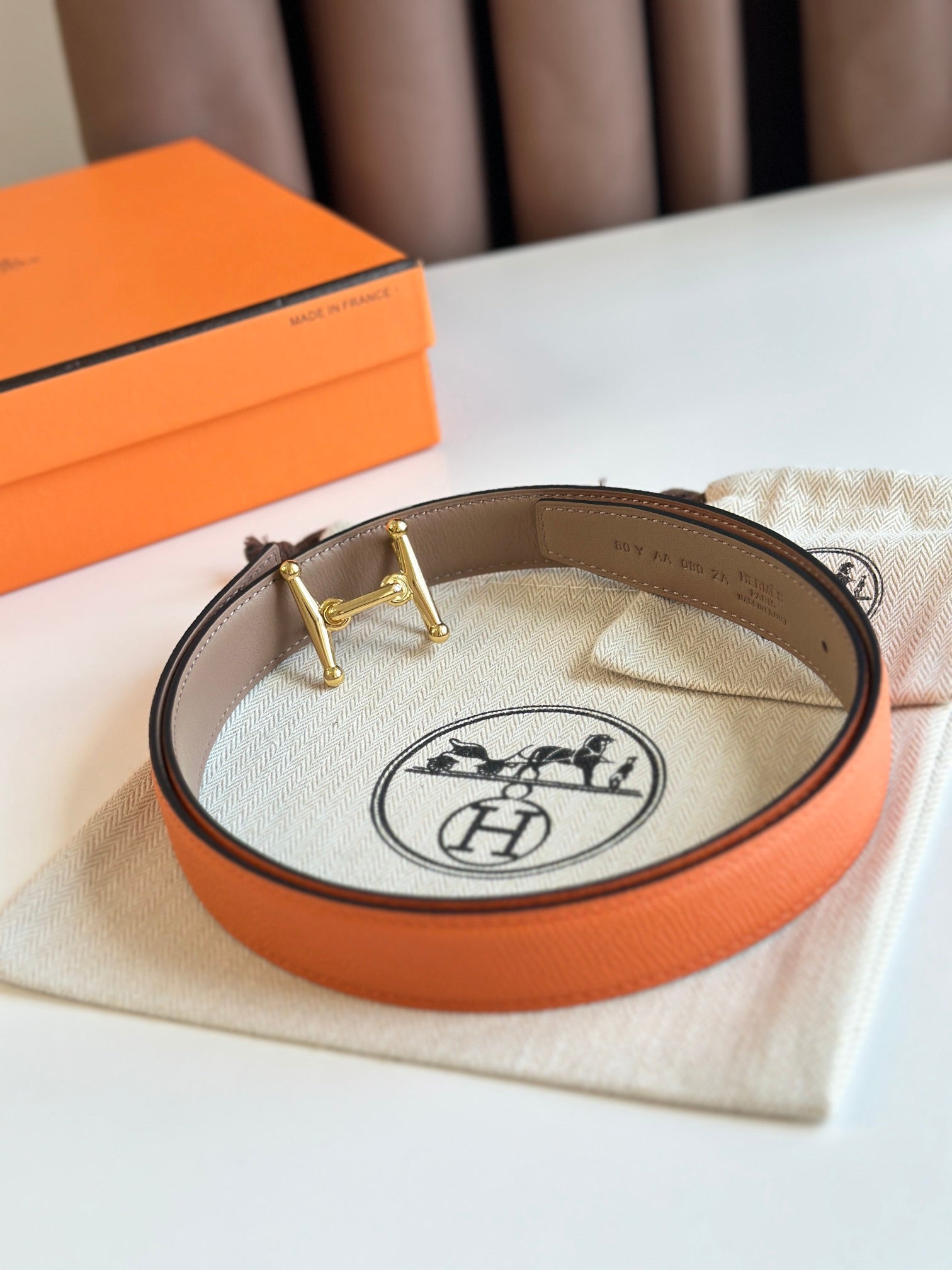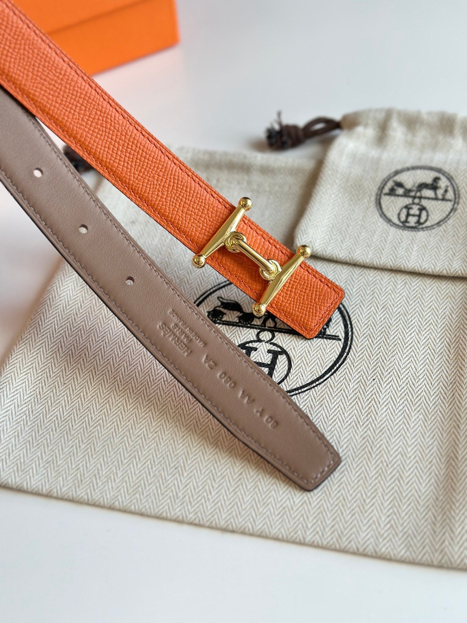 HM Gold Mors H buckle & Reversible 24 mm belt Orange Beige Leather 125355
