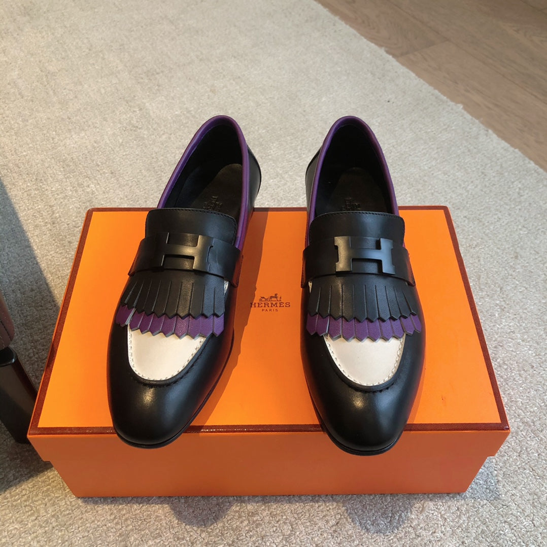 Royal Loafer Black Mix Purple and White Calfskin With Fringe Detail And Black Signature Buckle 509413