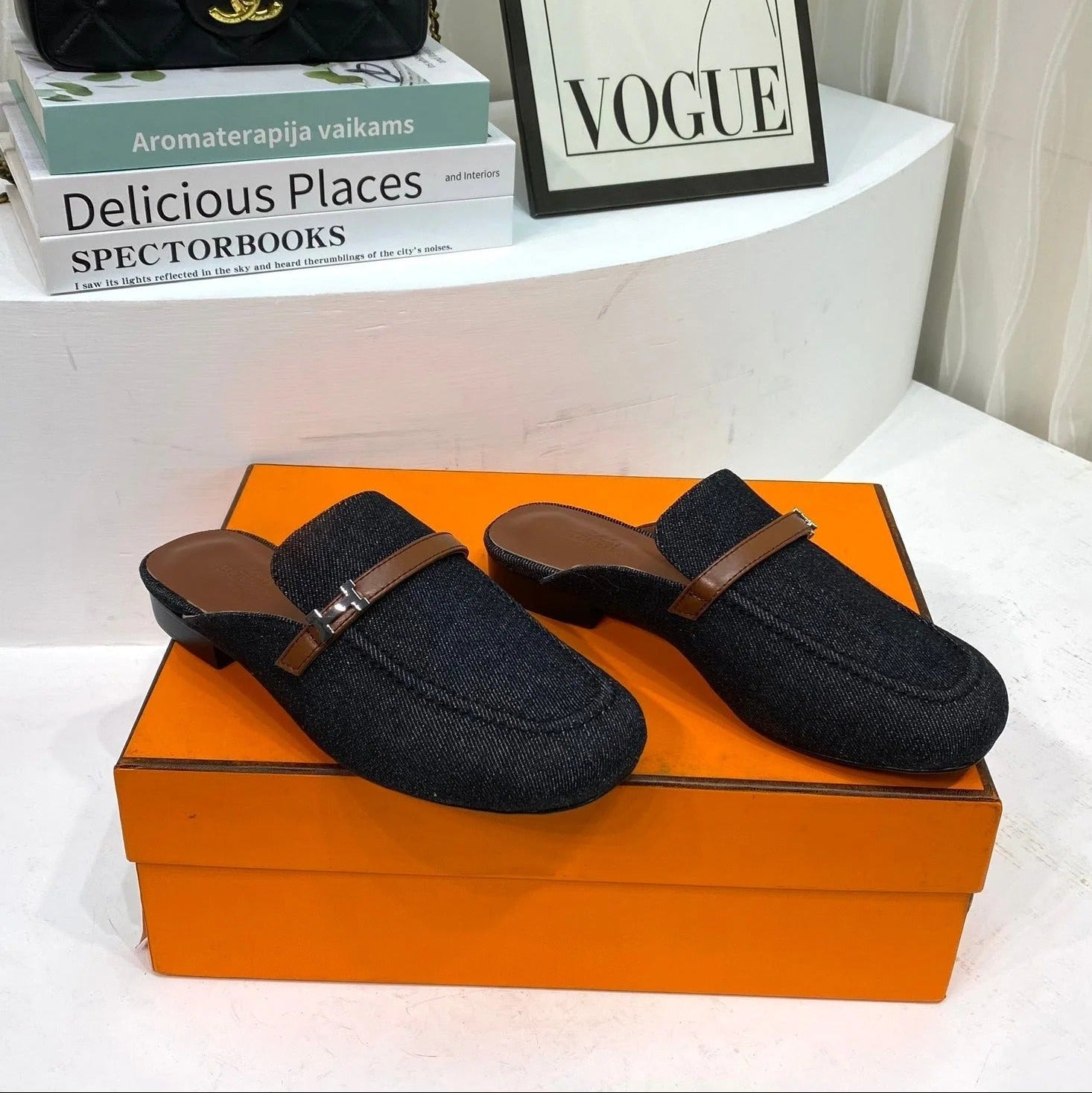 IENA MULE BLACK CANVAS AND BROWN CALFSKIN