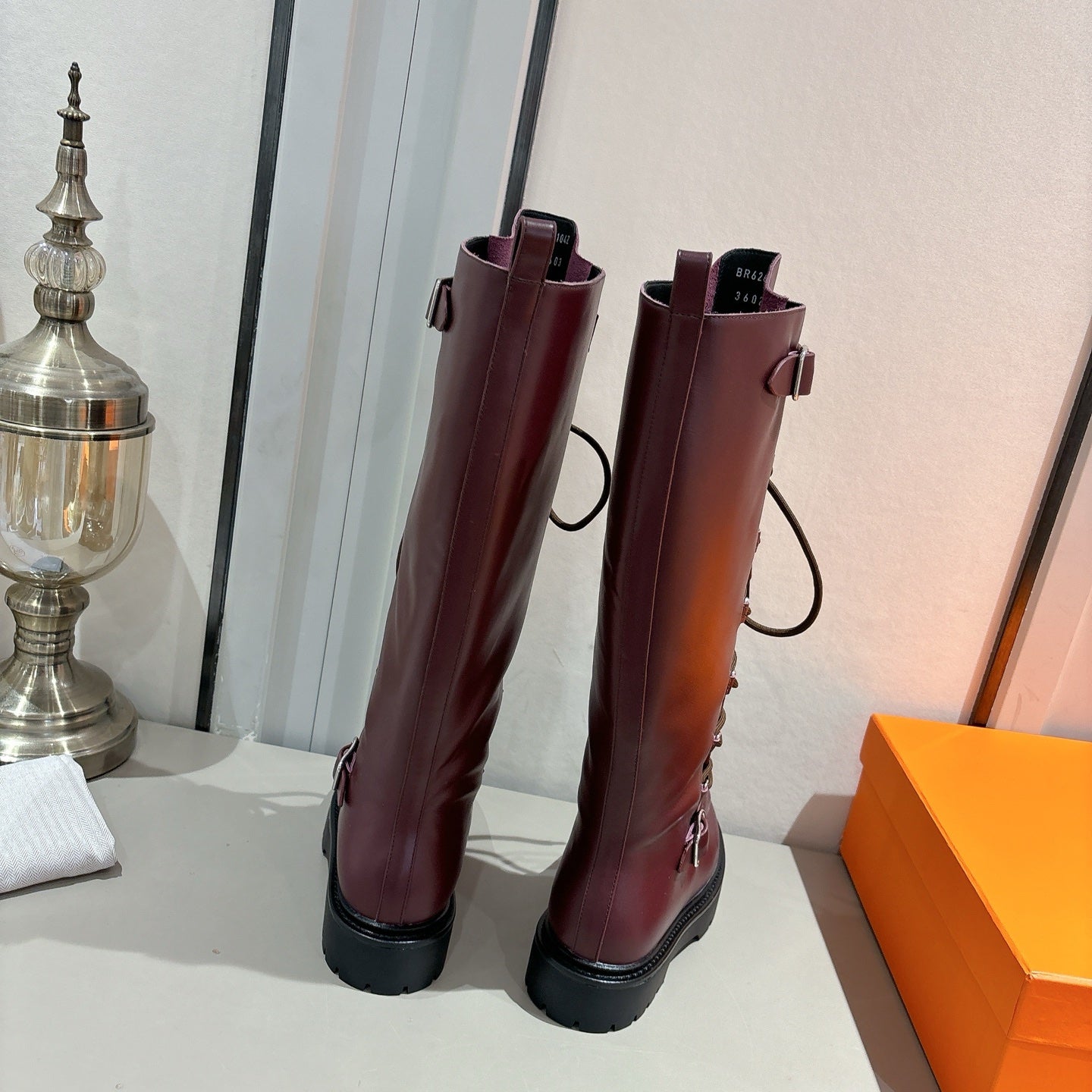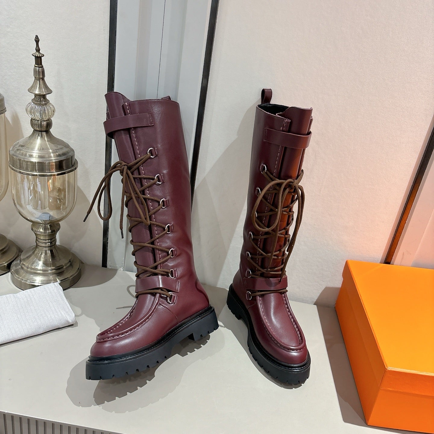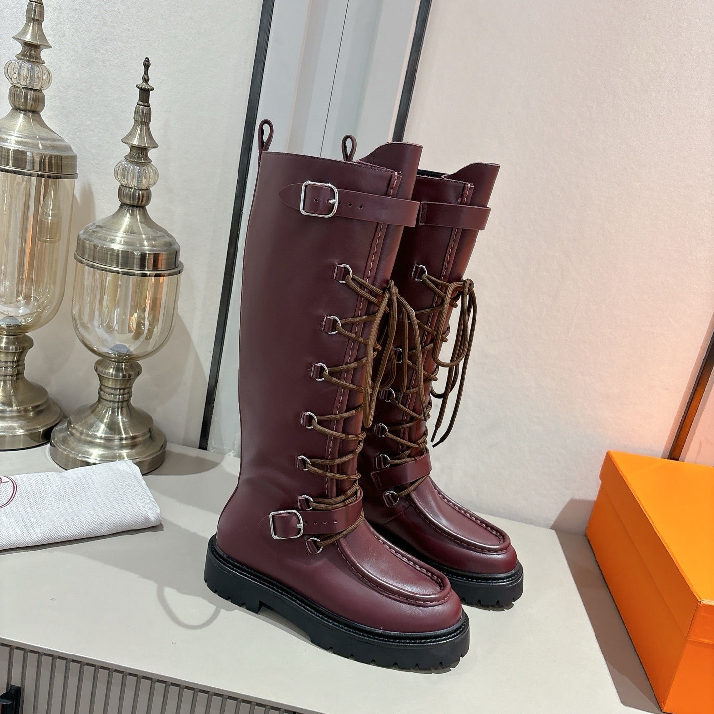 HM Lace Up Boots 25mm Belt Buckle Mauve Brown Leather 466590
