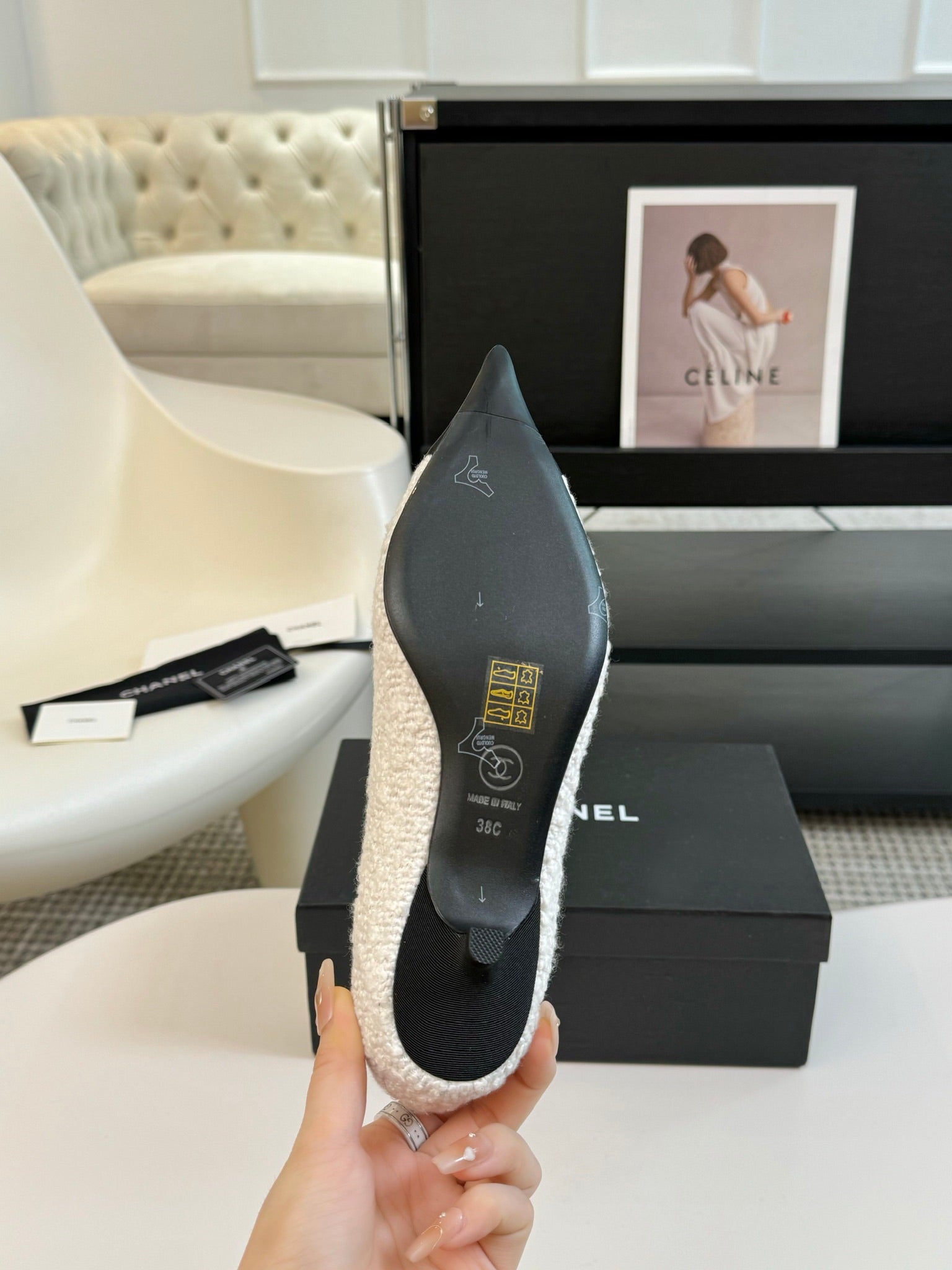 CC MARY JANE IN WHITE TWEED AND BLACK SATIN