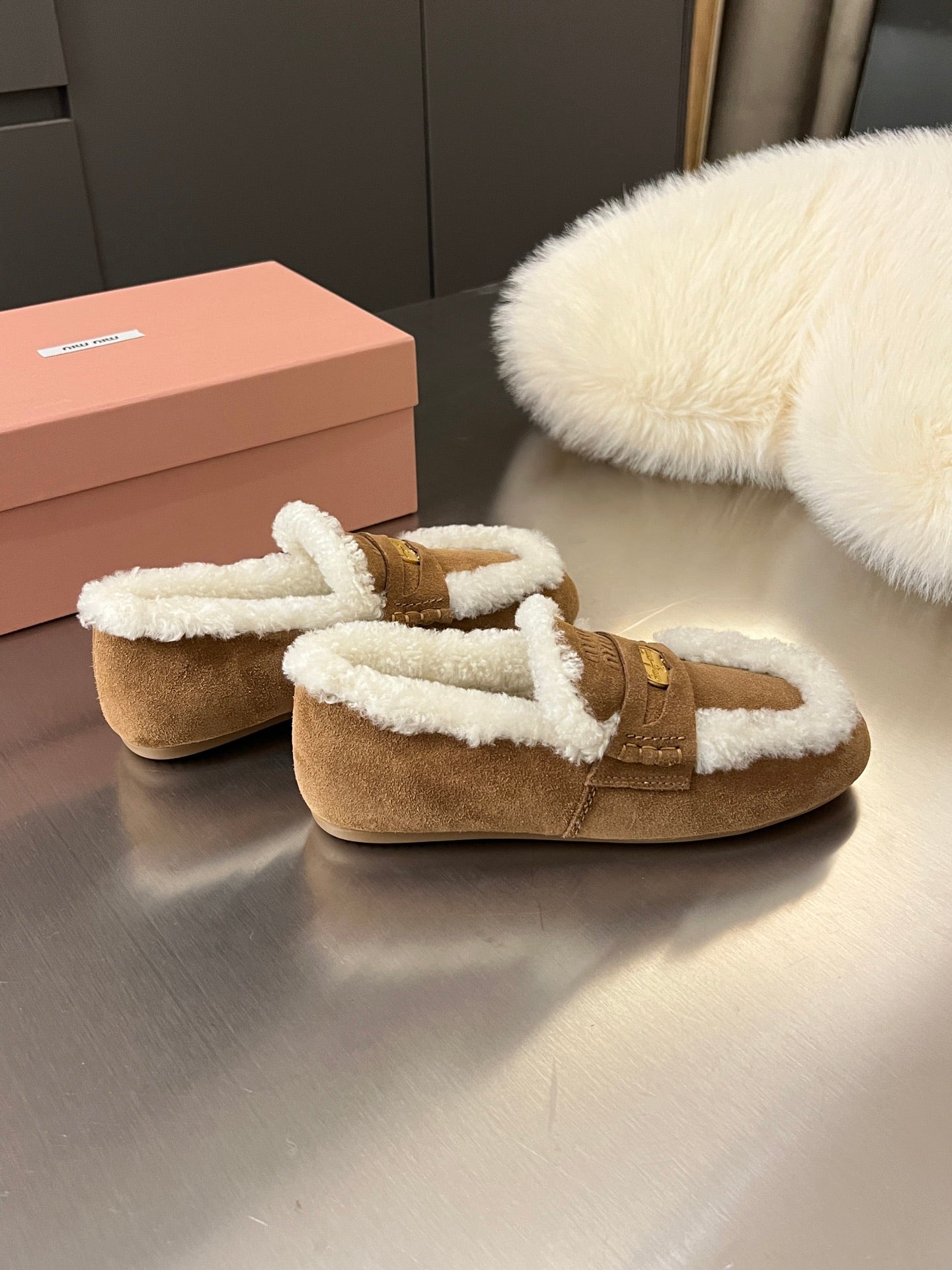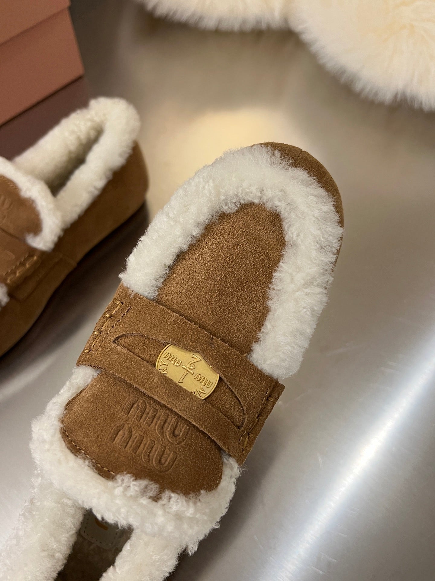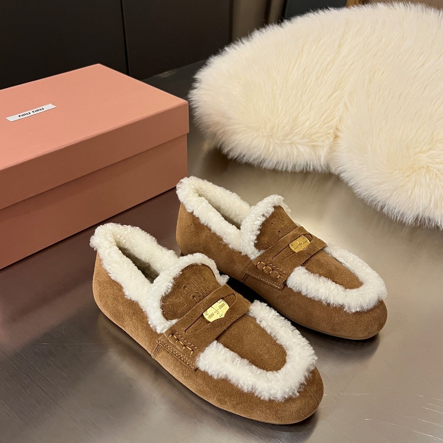 Miu Logo-Embossed Loafer Dark Brown Suede Shearling 455918