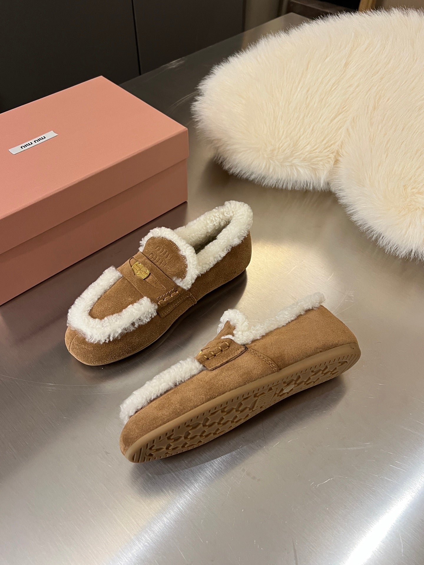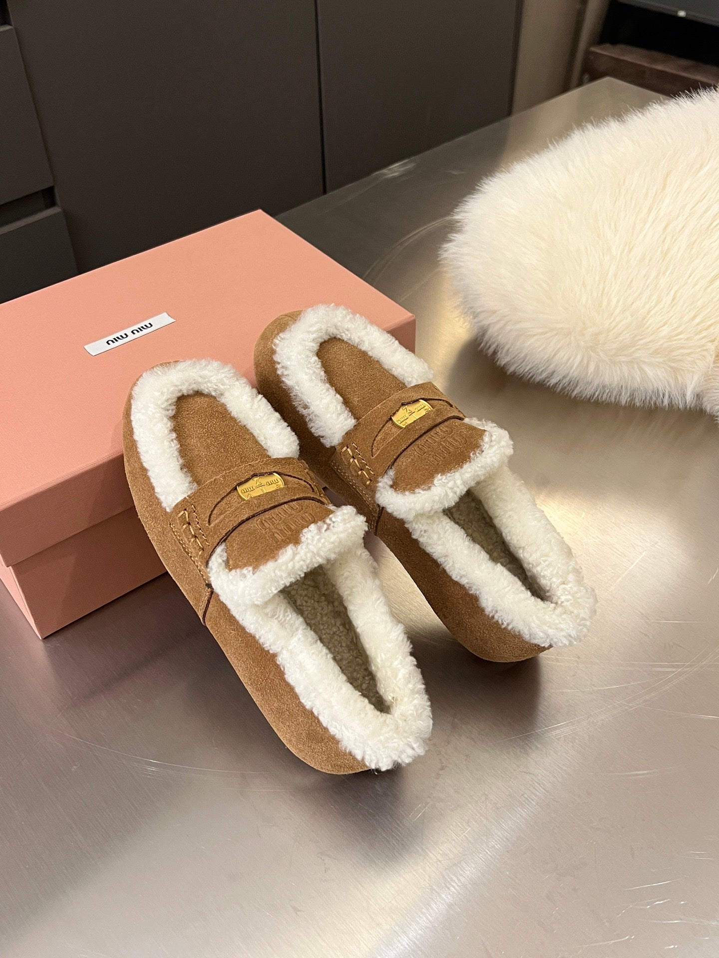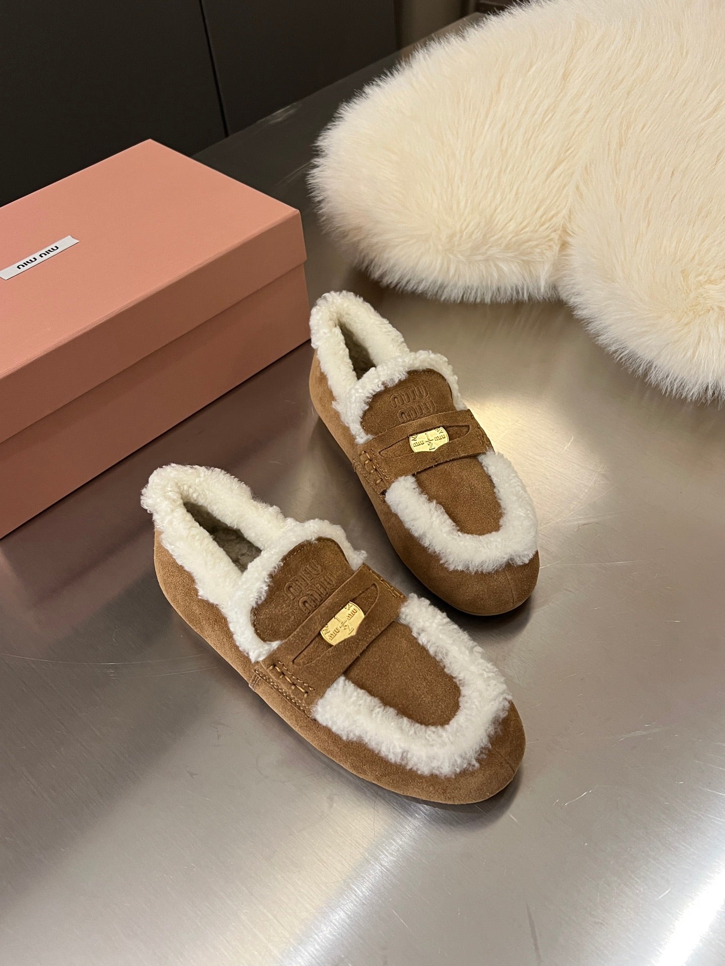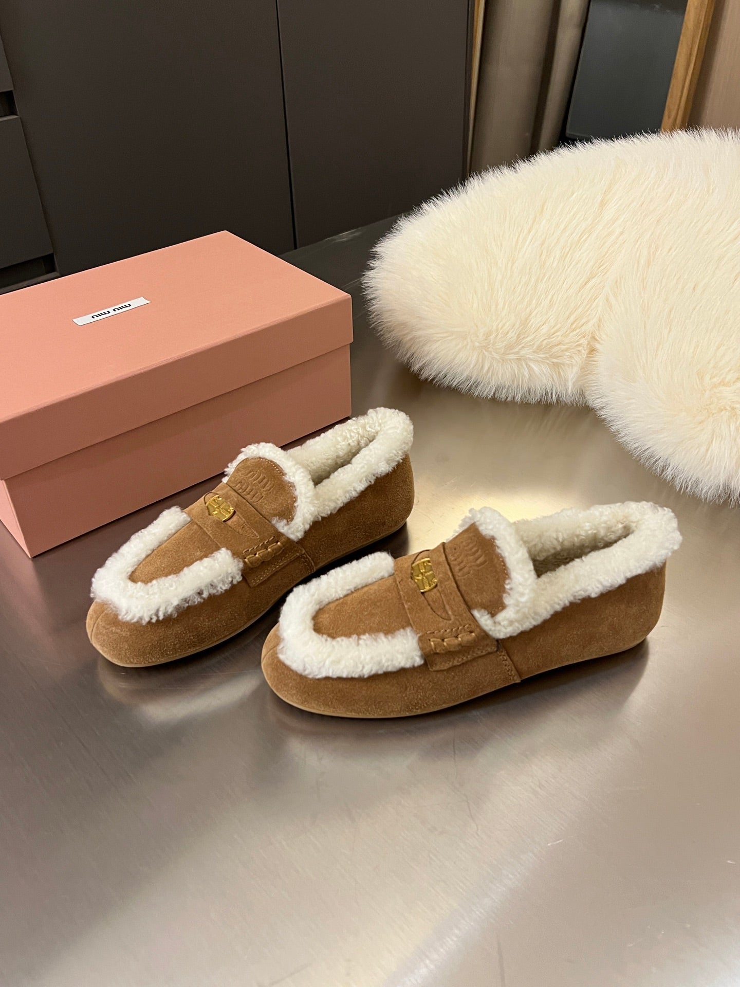 Miu Logo-Embossed Loafer Dark Brown Suede Shearling 455918