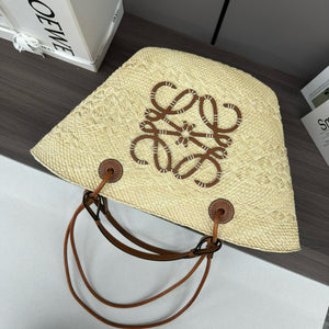 LOE ANAGRAM BASKET 46CM BAG IN NATURAL MIX BROWN IRACA PALM AND CALFSKIN