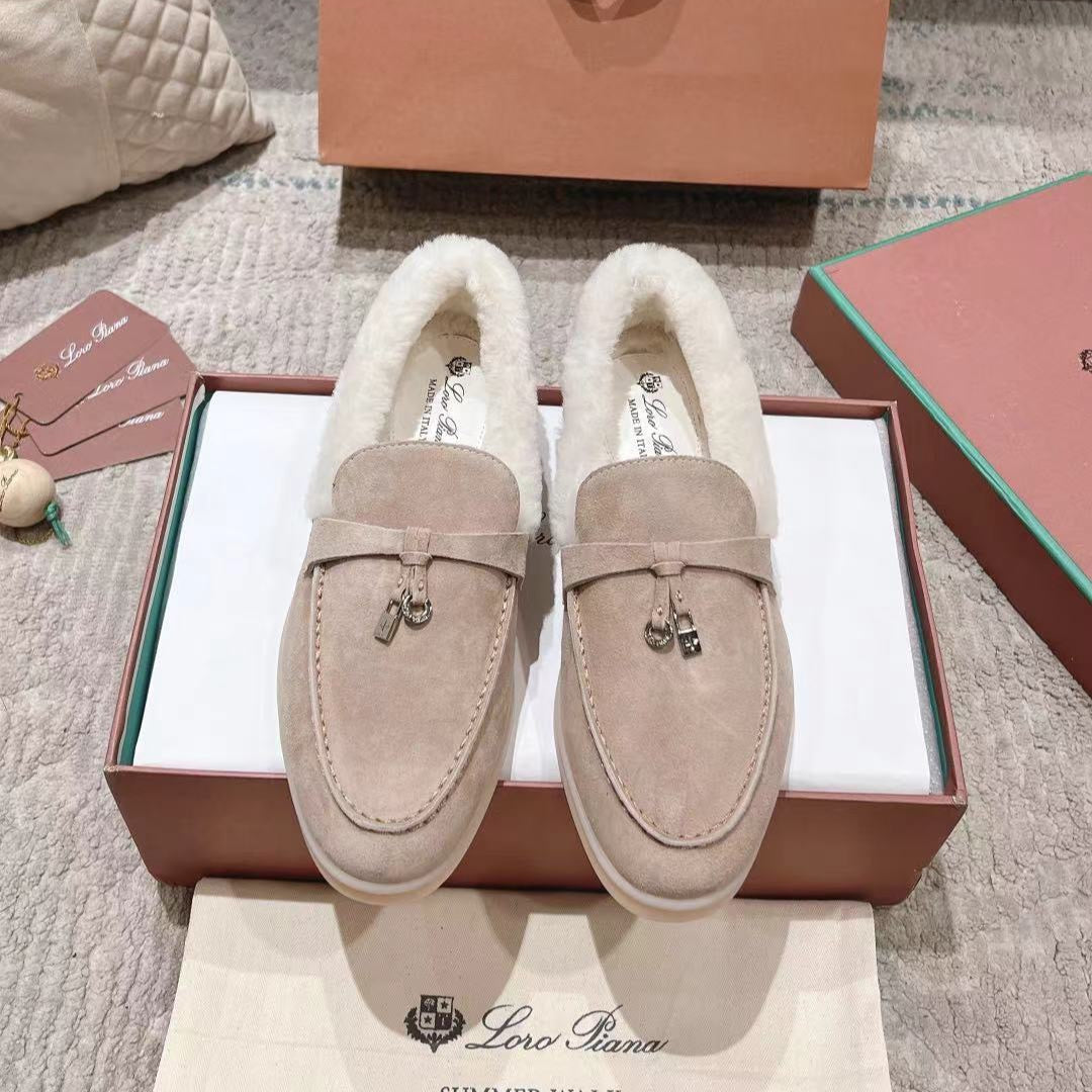 LP Summer Charms Walk Loafers Light Brown Beige Mix White Suede With Rabbit Fur Lining 206250