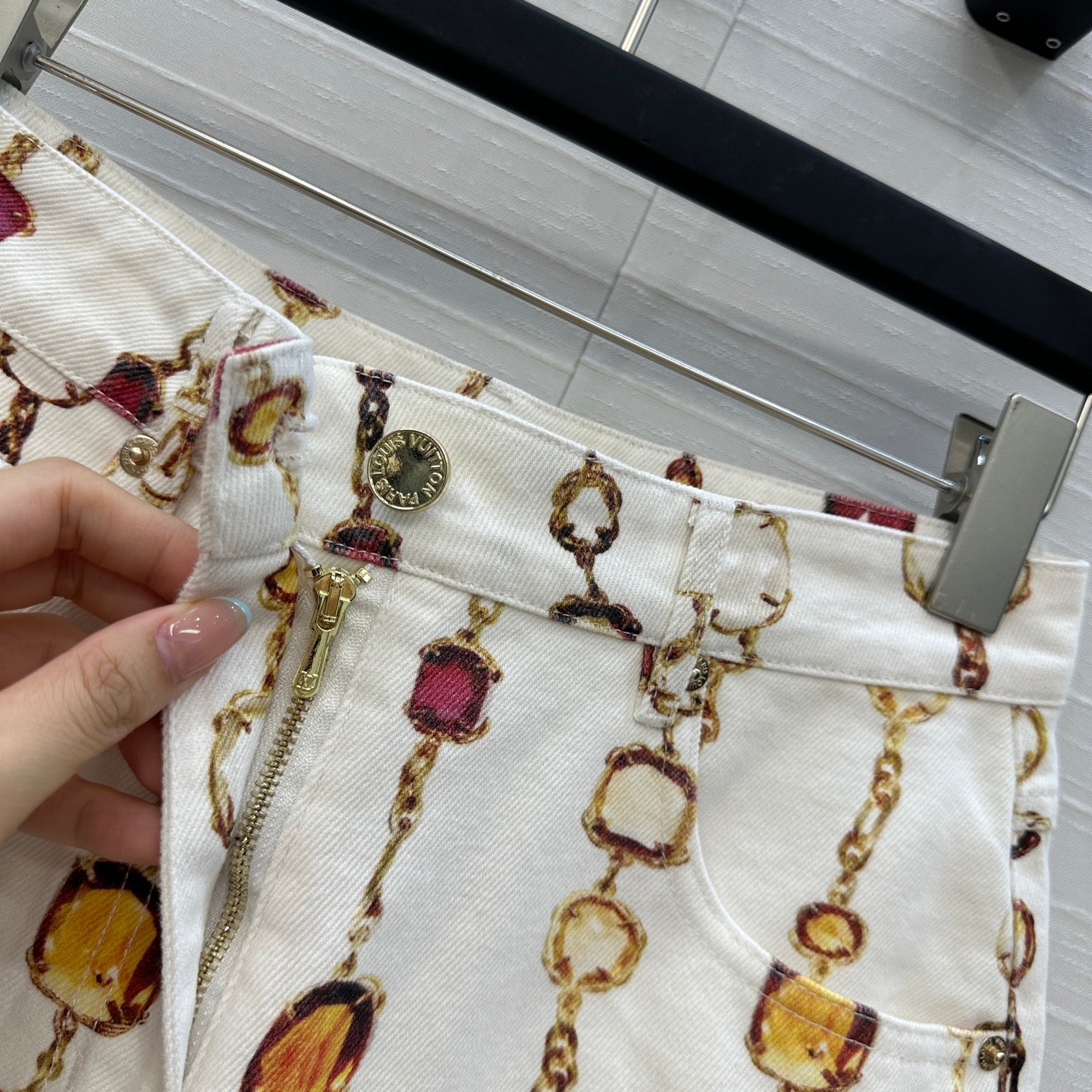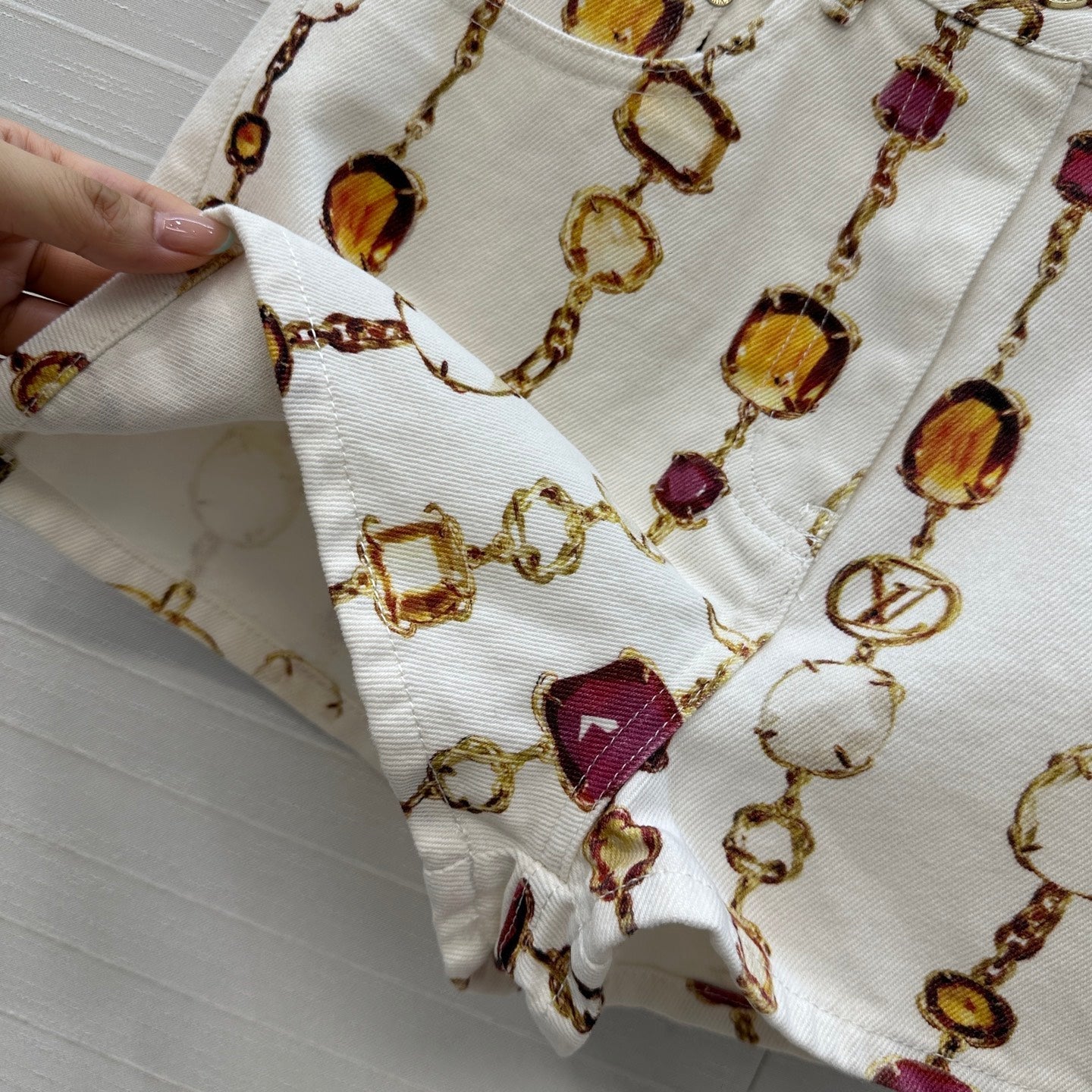 LV 25 Bourgoise Series Printed Zipper Denim Shorts White Cotton
