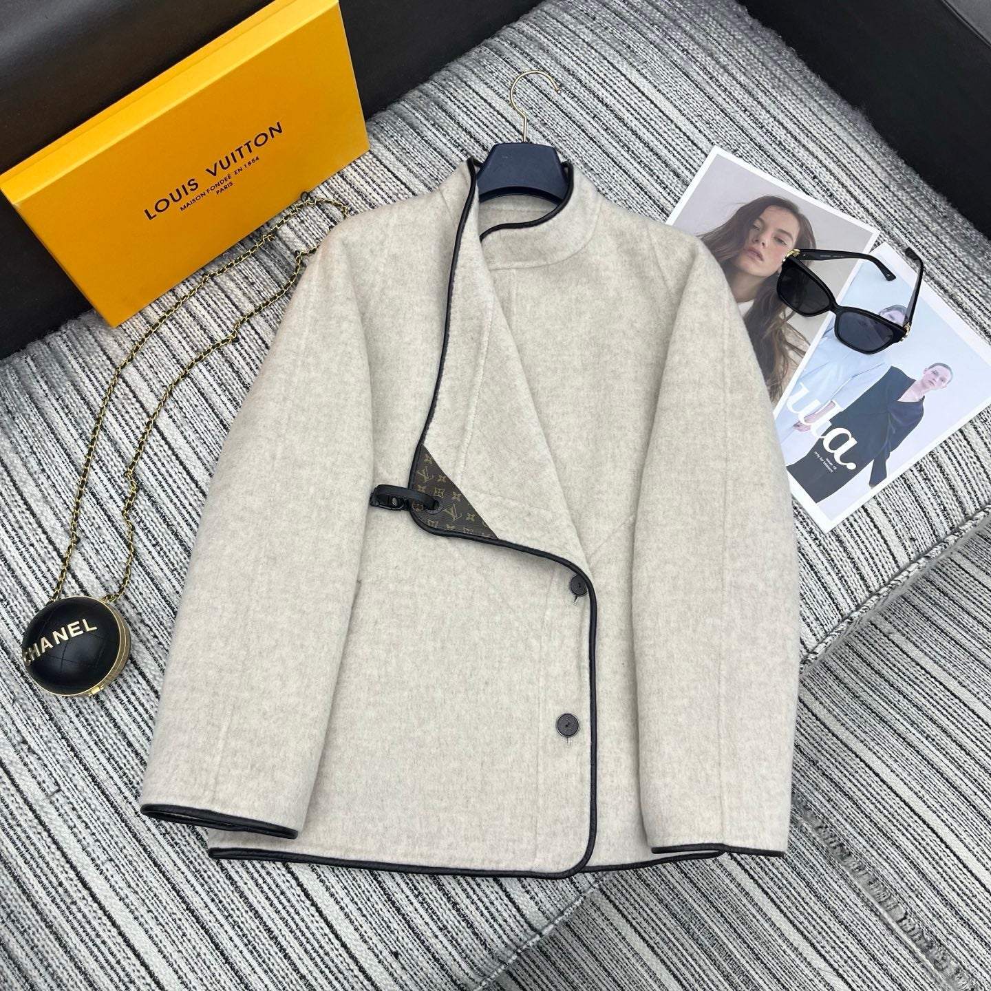 LV 25FW Double-Faced Wool Coat Jacket Lambskin Edge Light Gray 311700