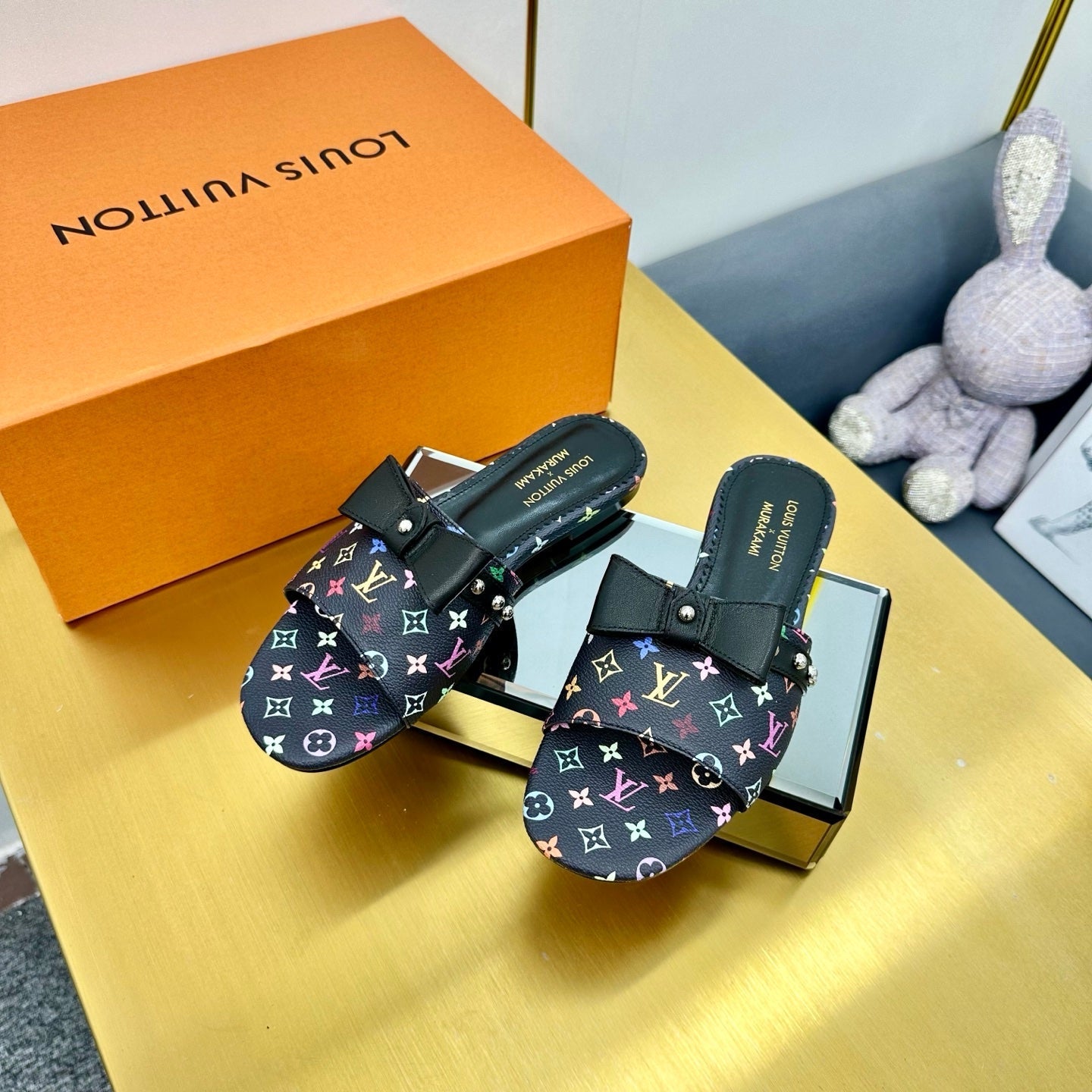 LV 25C LV x TM 6AM Flat Mule Black Bow Mocha Brown with Monogram Multicolore Leather 219951