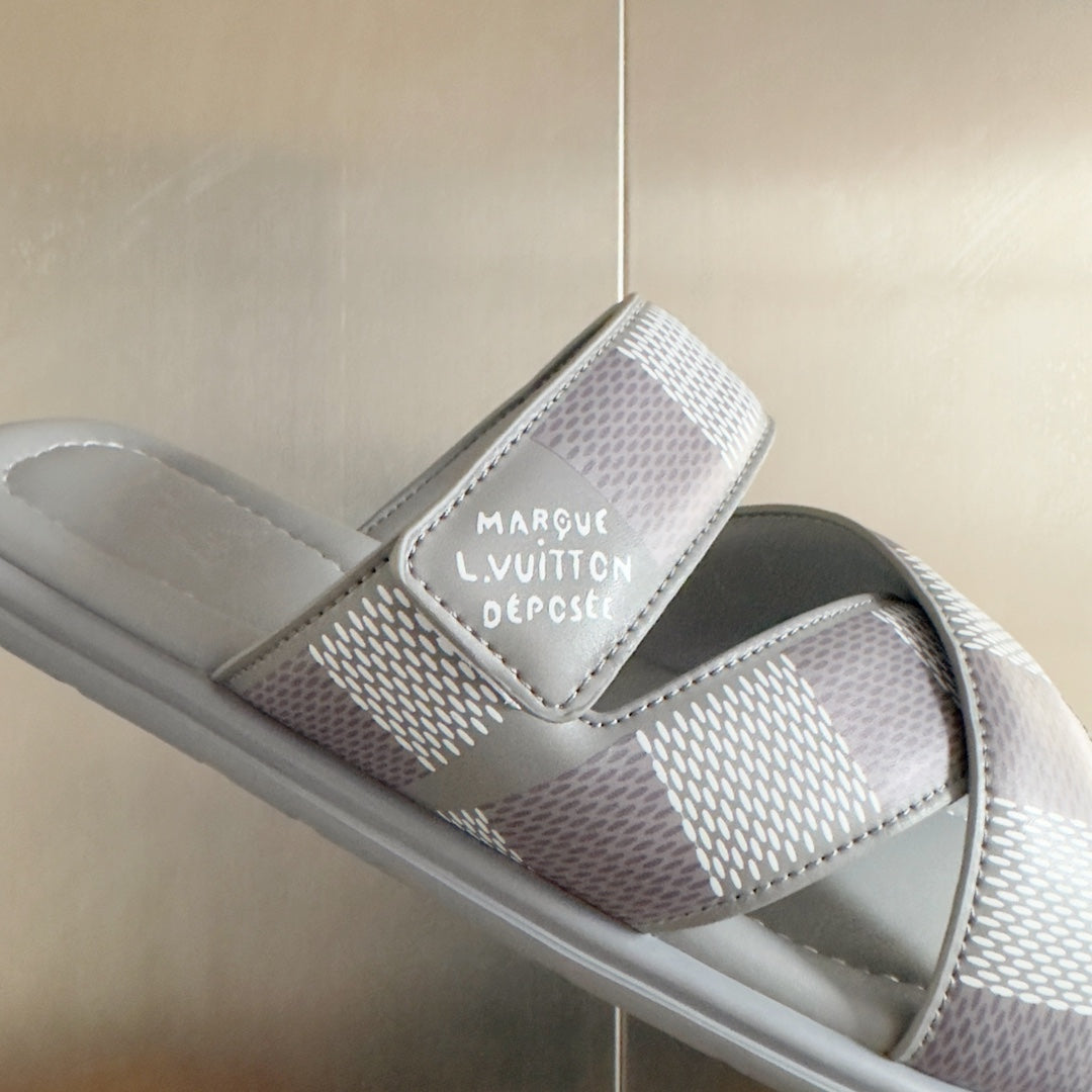 • Premium LV men's slippers, synchronizing with the 2024 early autumn runway collection. The slippers feature a high-quality fabric upper and an original, exclusive comfort sole, ensuring exceptional comfort. These are original factory-followed products.