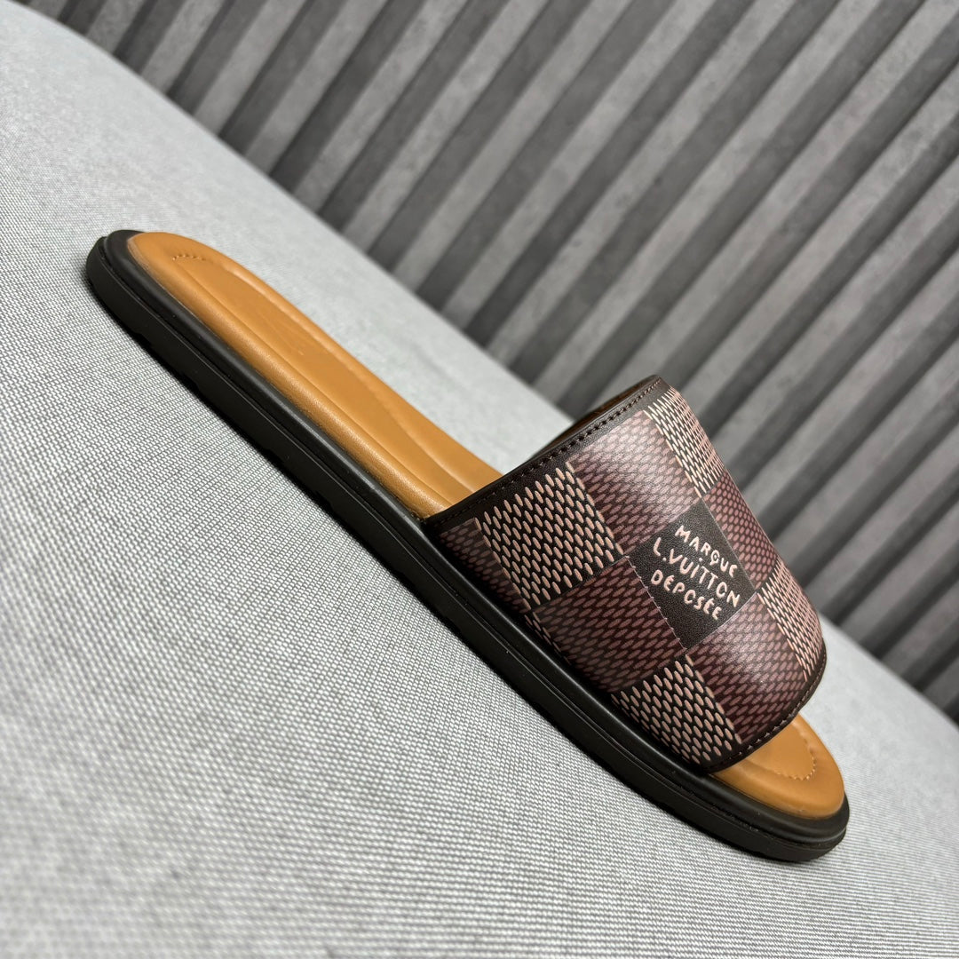 • Premium LV men's slippers, synchronizing with the 2024 early autumn runway collection. The slippers feature a high-quality fabric upper and an original, exclusive comfort sole, ensuring exceptional comfort. These are original factory-followed products.