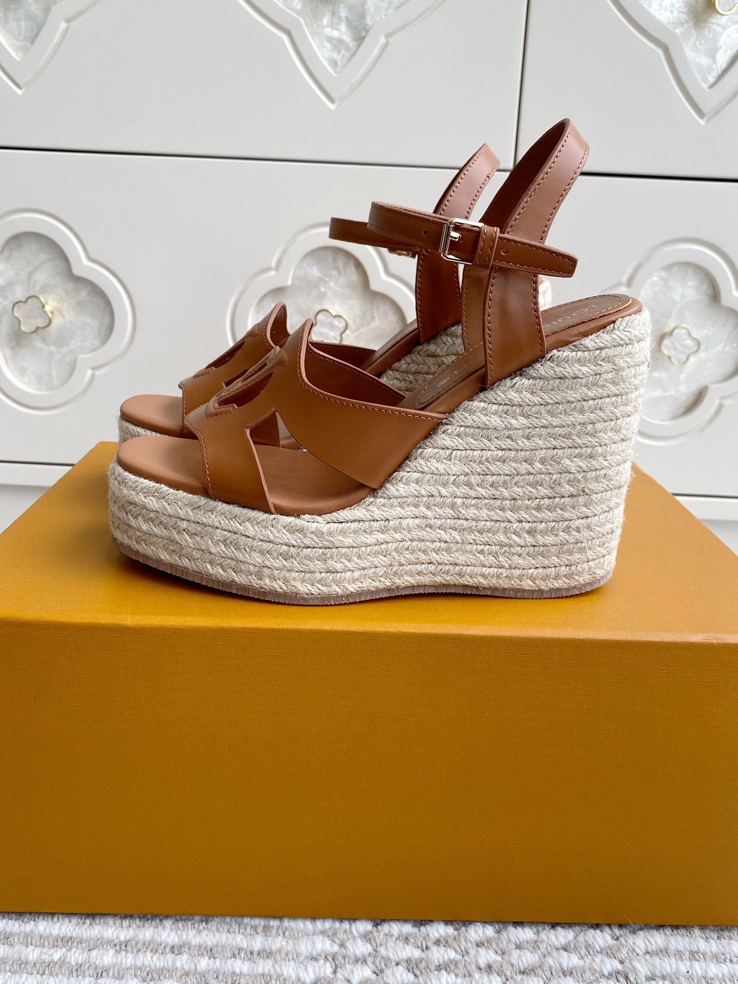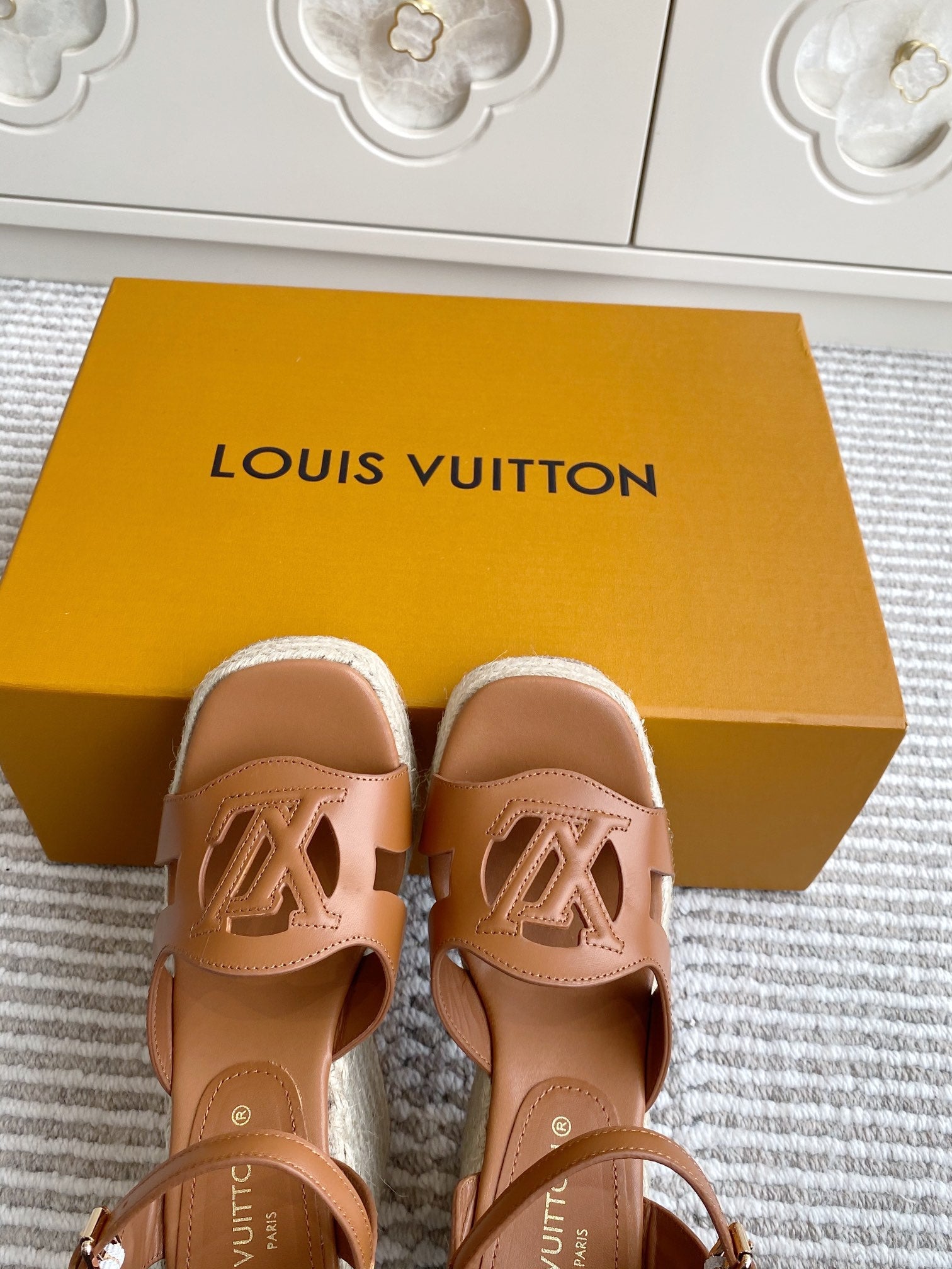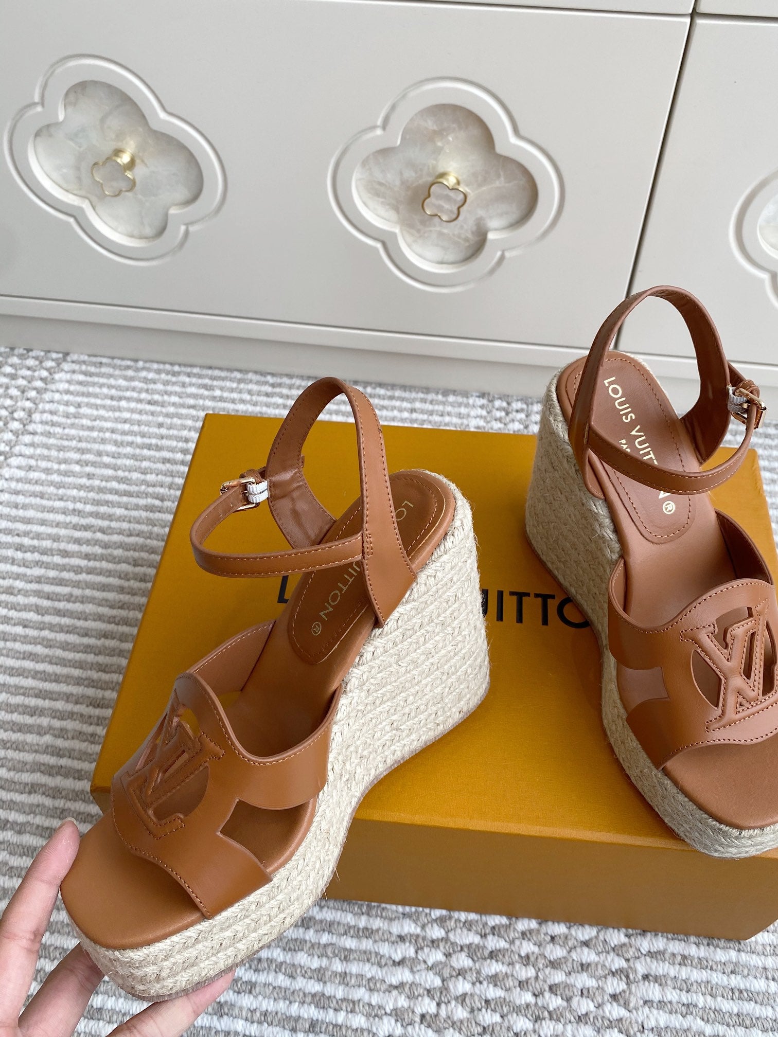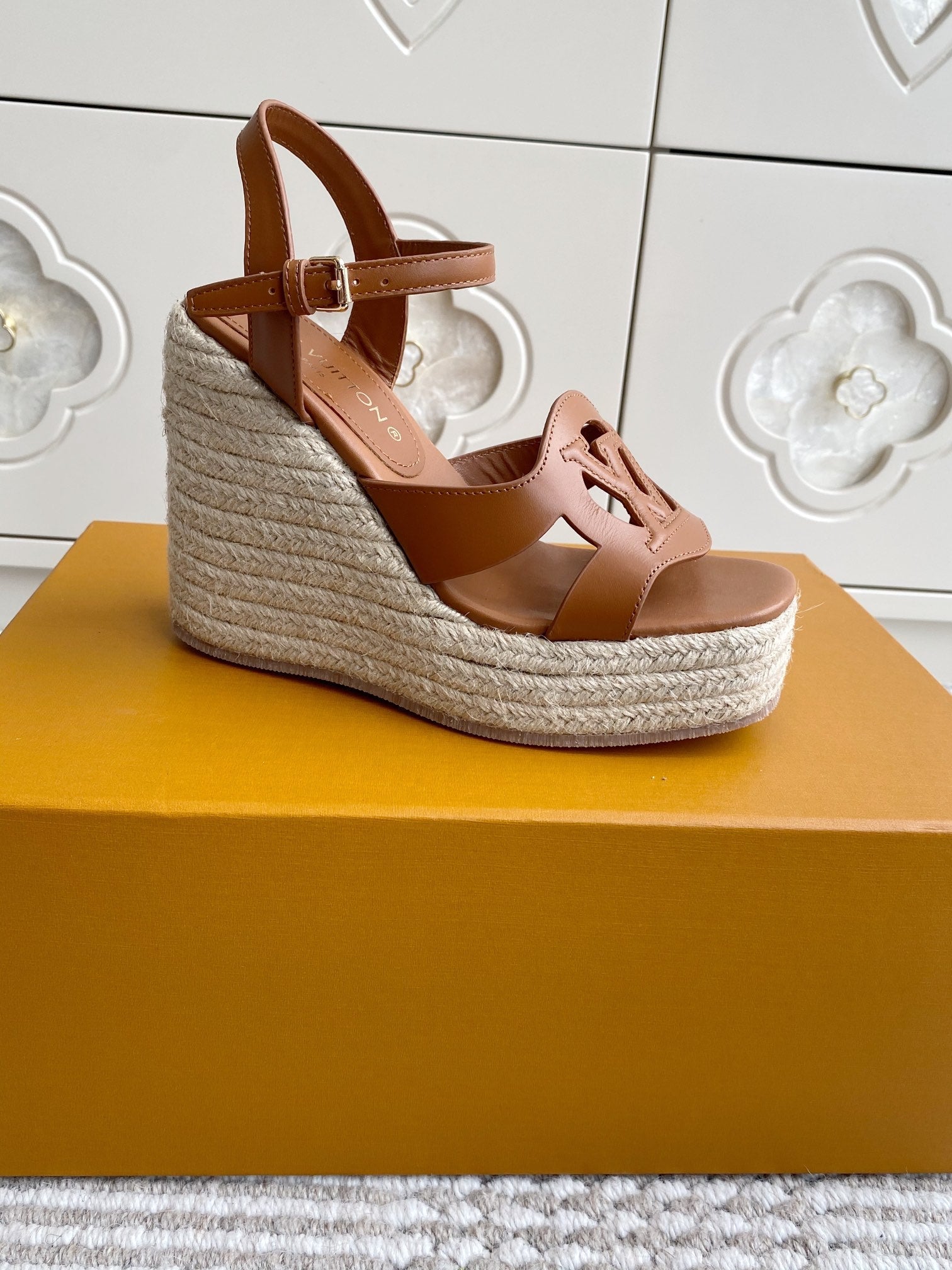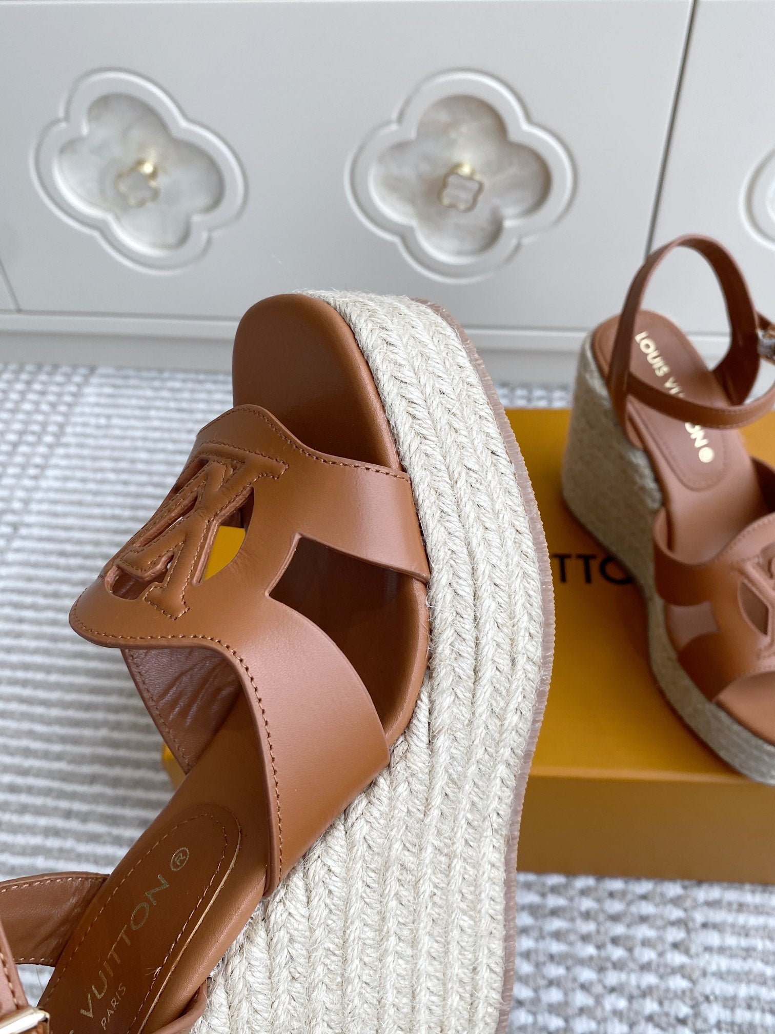 LV Letter Hollow Straw Wedge Sandals 11.5cm Gold Cowhide 291574
