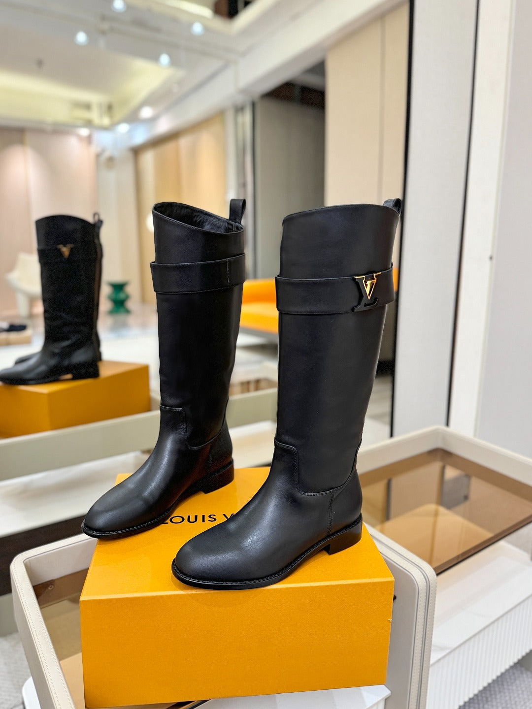 LV Donkey Metal Buckle-Decorated Knight Boots Black Cowhide 504713