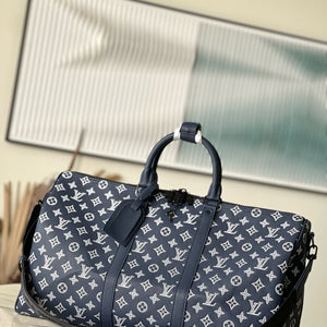 LV Keepall Bandouliere 50 Navy Blue Monogram Shadow Cowhide