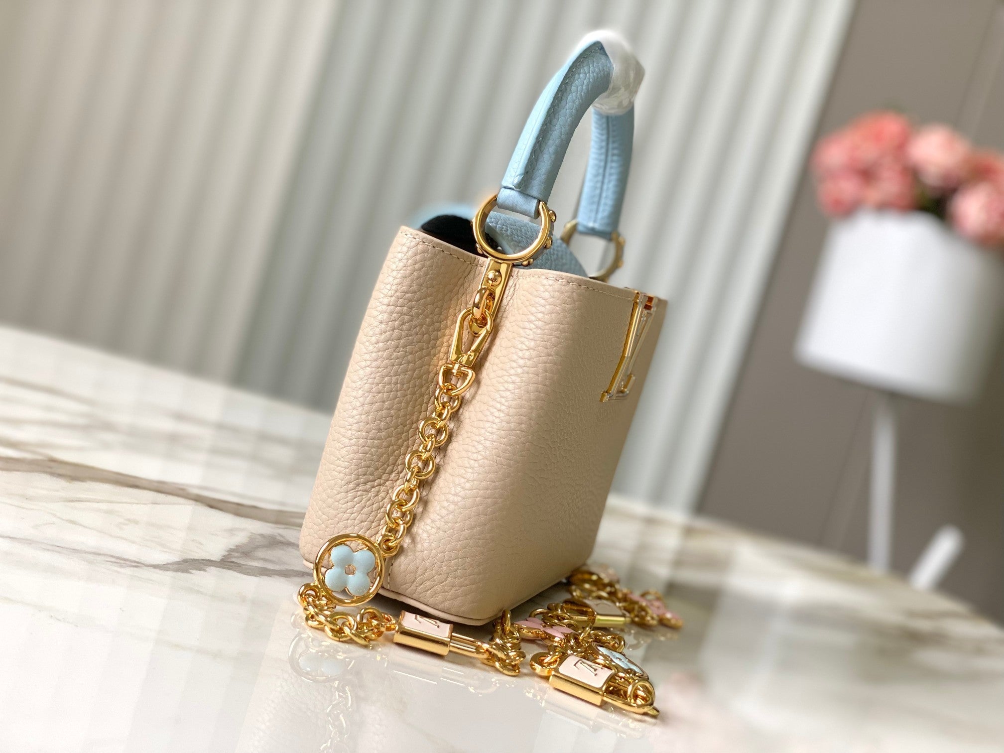 capucines mini 21 beige cloud blue taurillon leather gold hardware