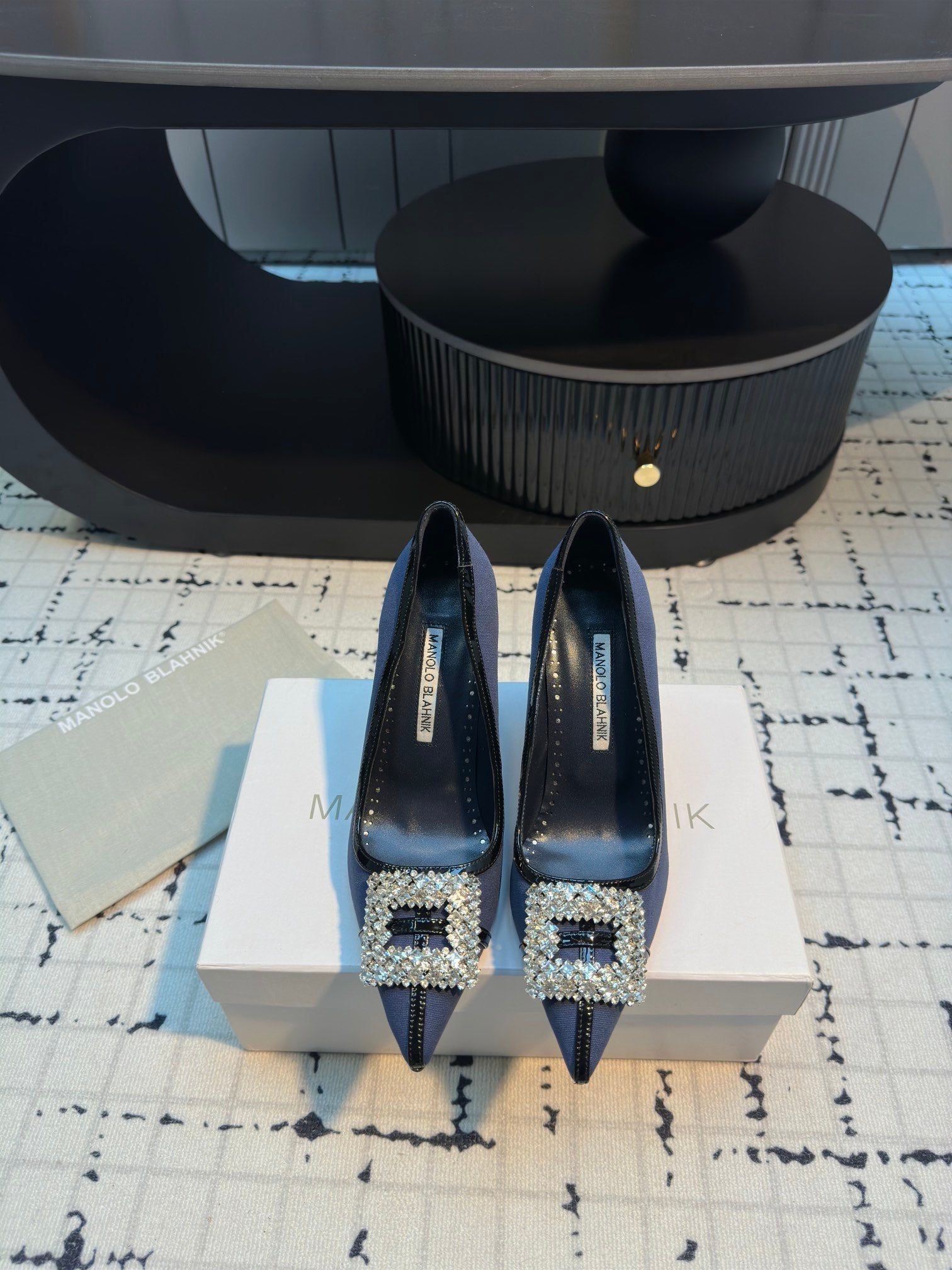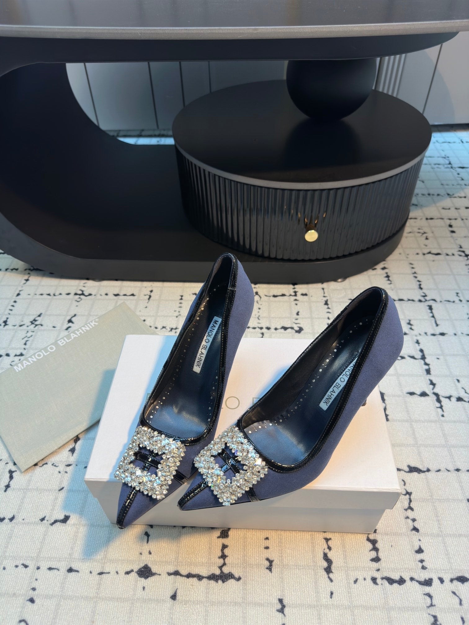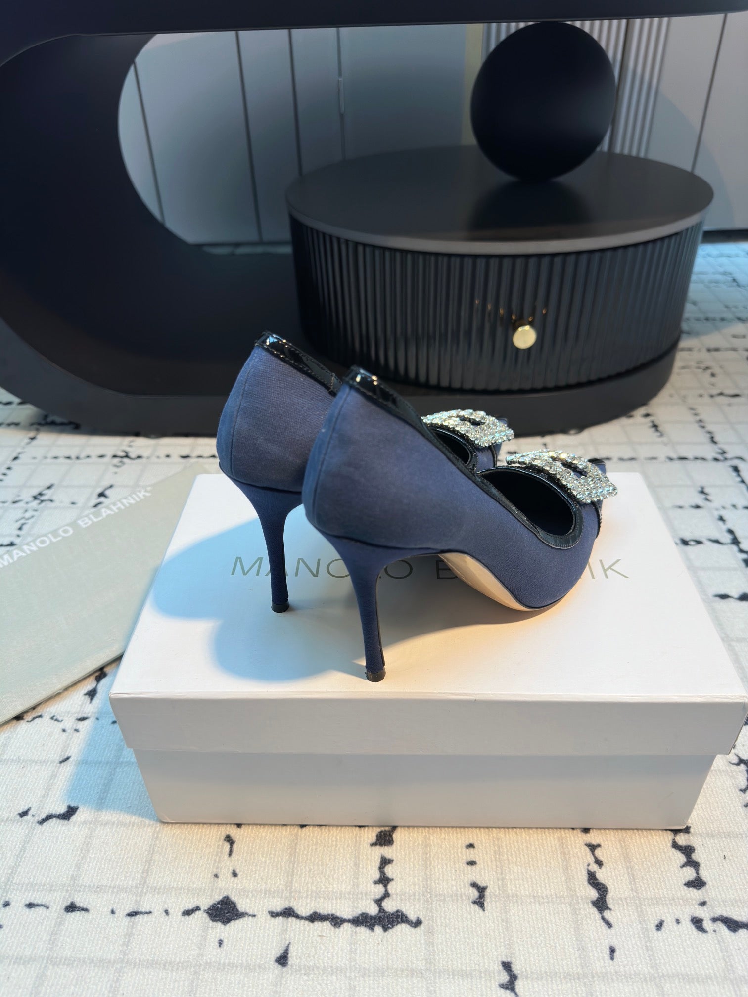 Hangisi 100 Dark Blue Linen with Black Leather Jewel Buckle Pumps 161070