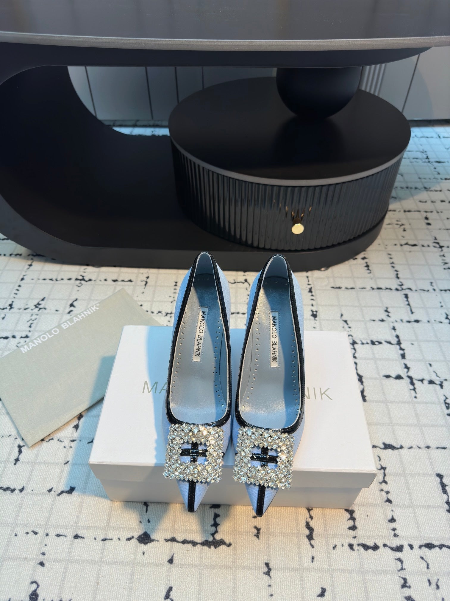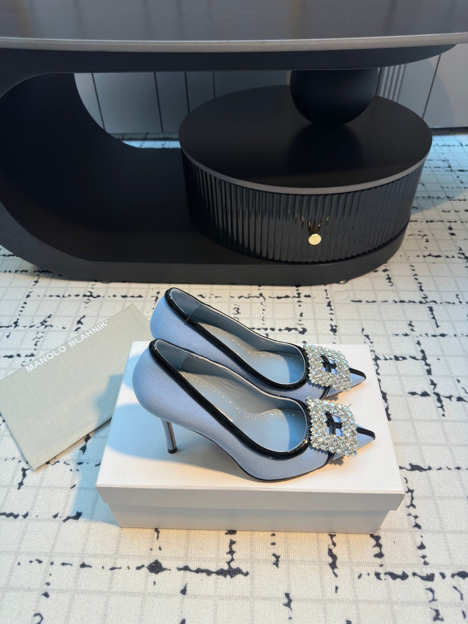 Hangisi 100 Ocean Blue Linen with Black Leather Jewel Buckle Pumps 161068