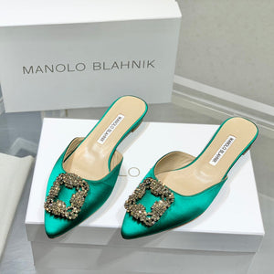 Manolo Buckle Flast Mules Green Silk 327517