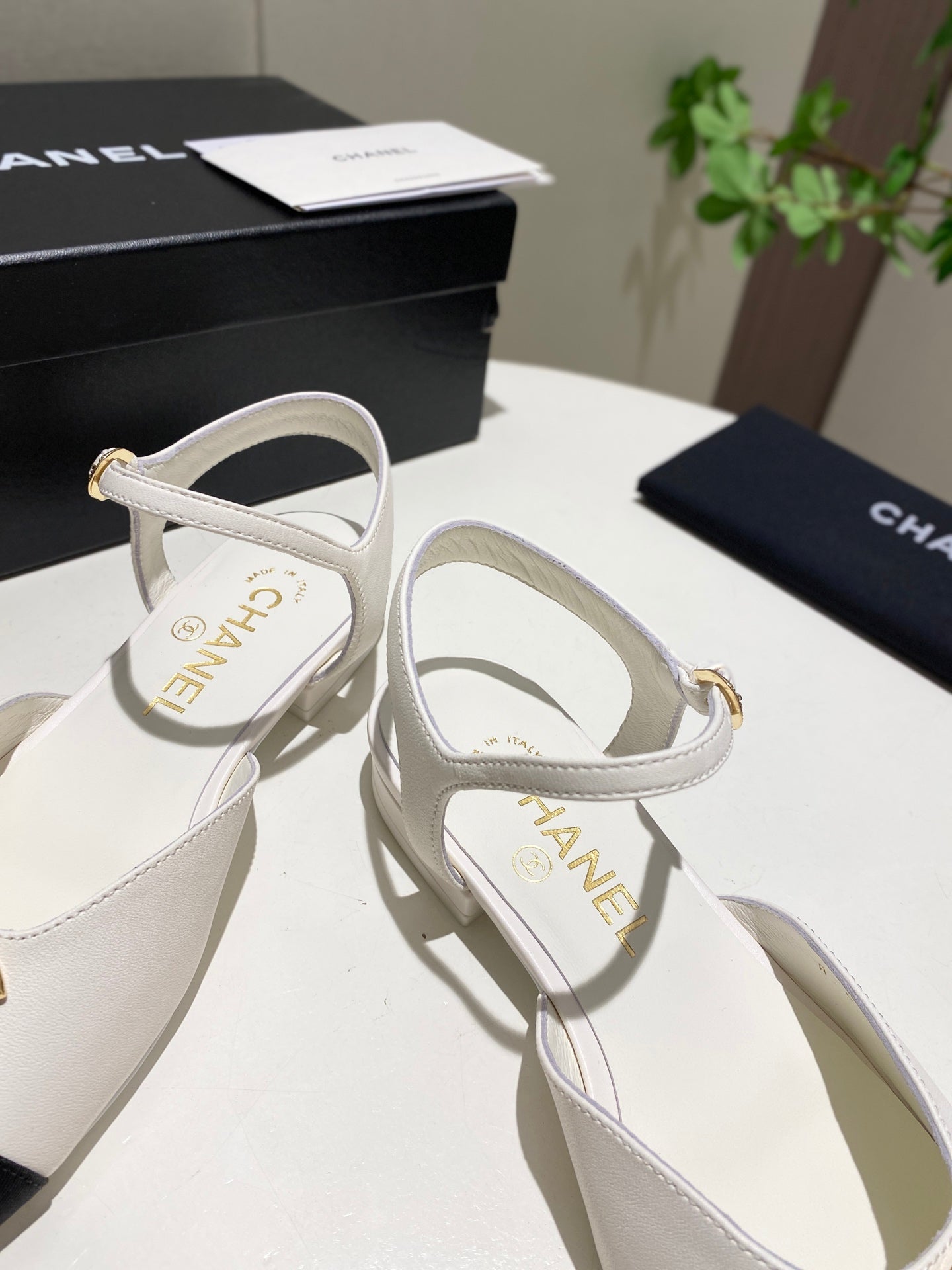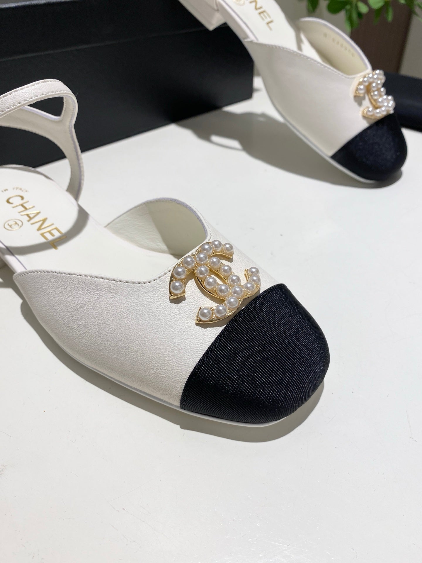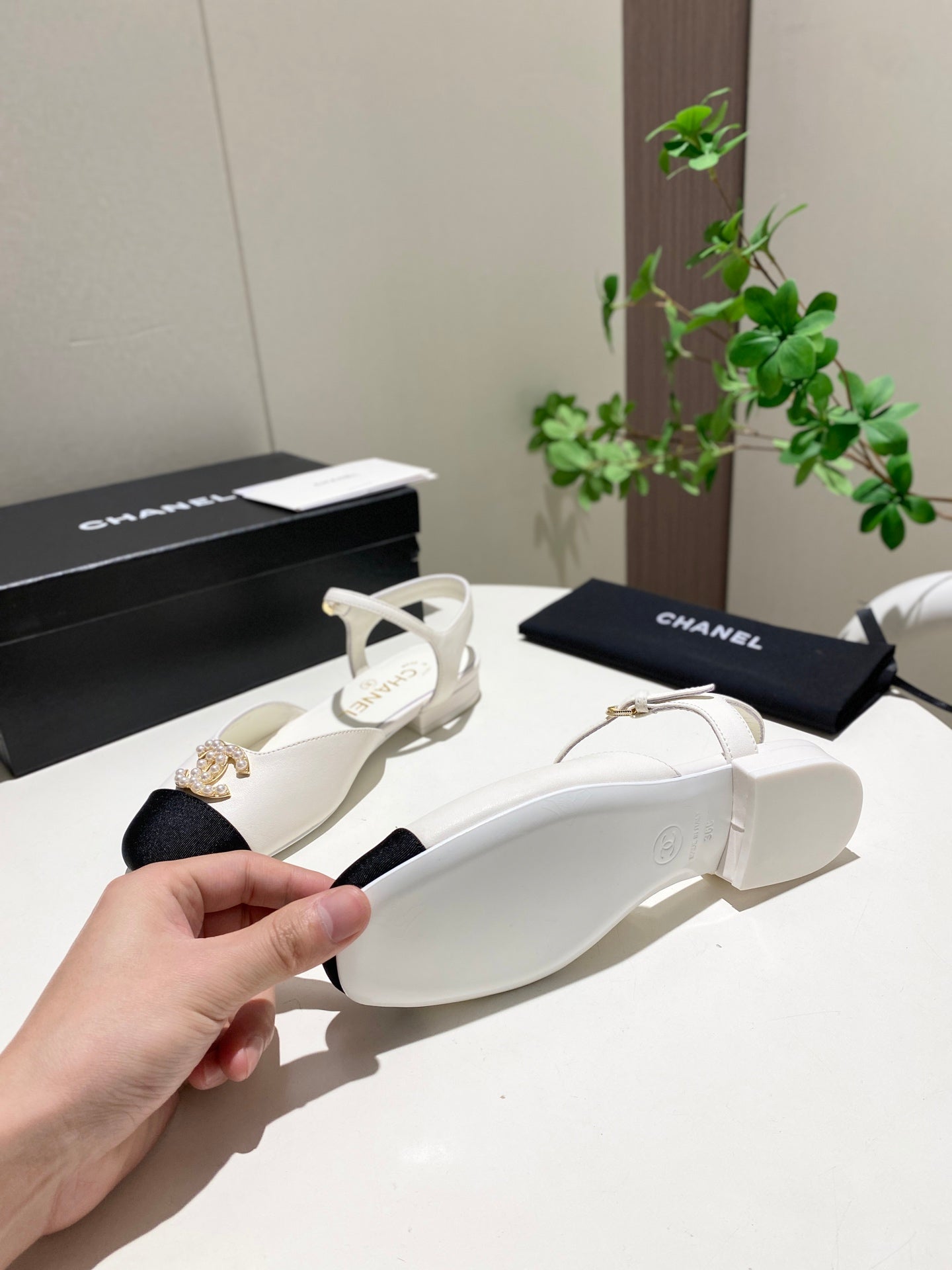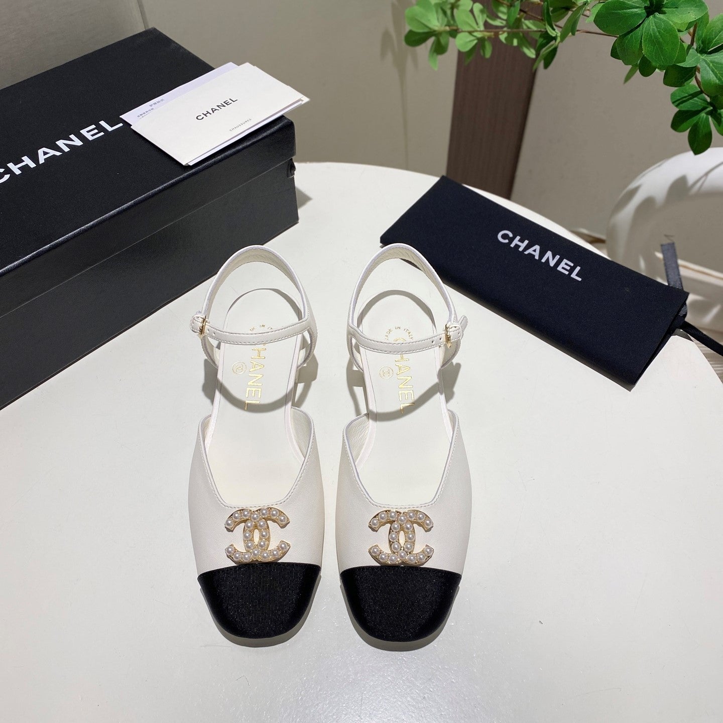 CC 25P Pearl Buckle Mary Jane Sandals Black White Sheepskin Frabic 466989