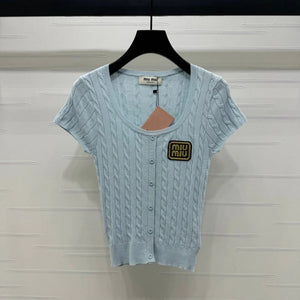 MIUMIU U-NECK KNITTED SHORT-SLEEVE TOP LIGHT BLUE 274948