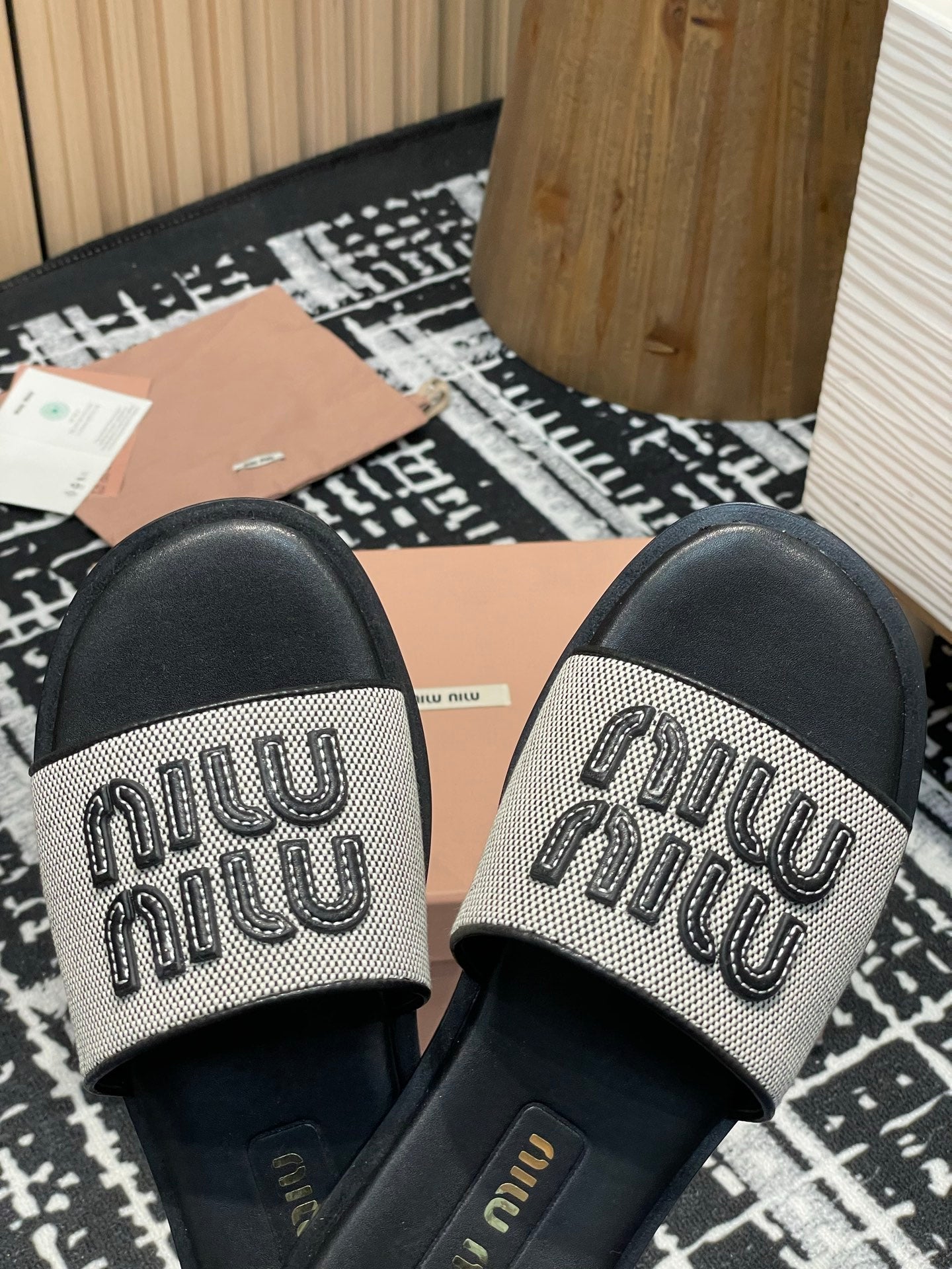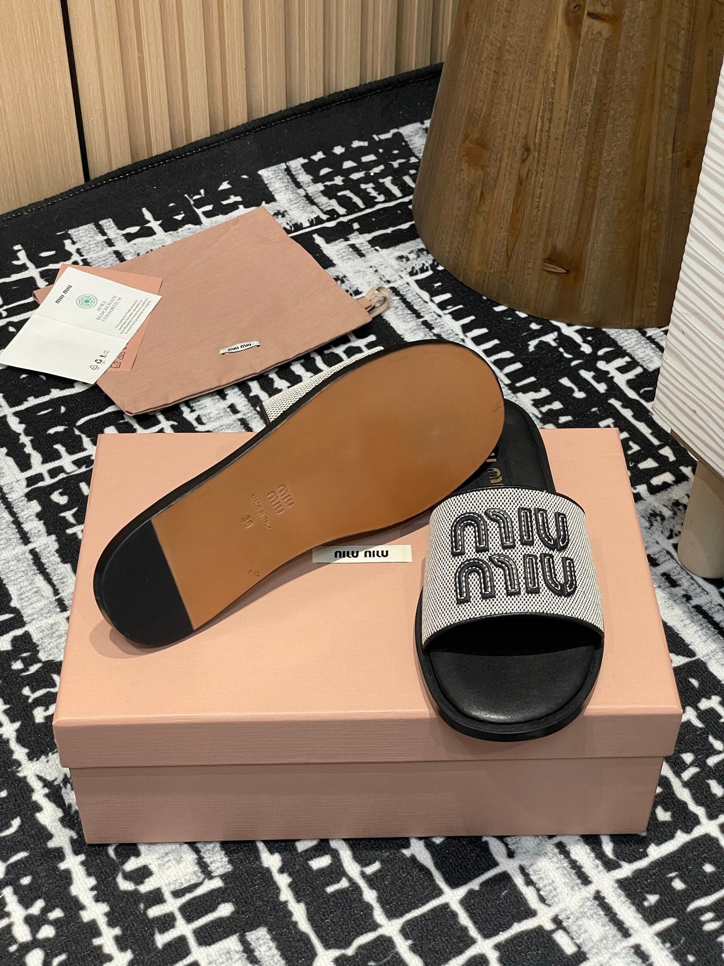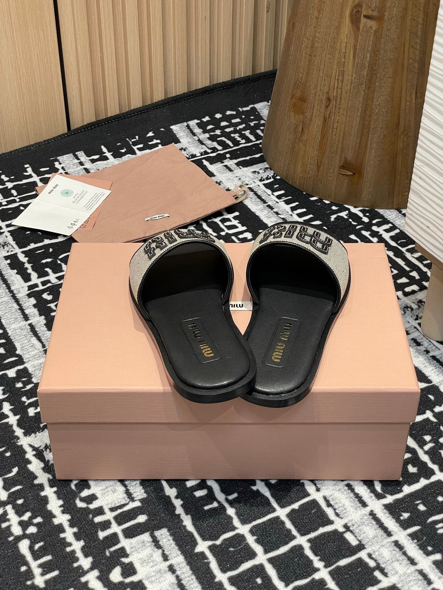 Miu 25S Beige and Black Canvas and leather slides 227133