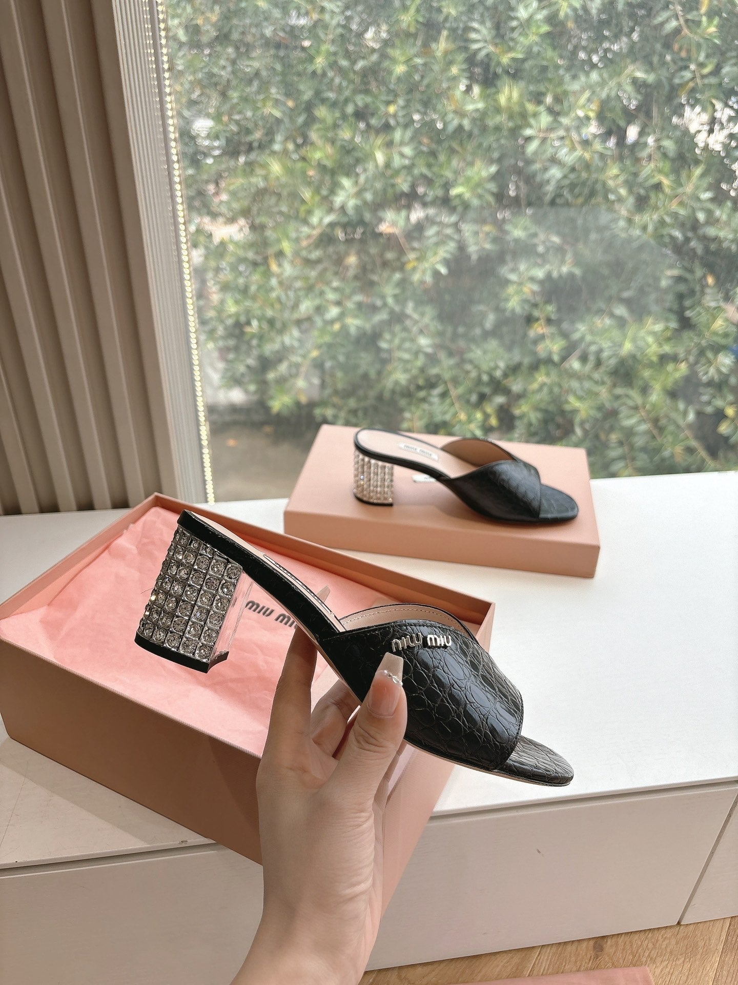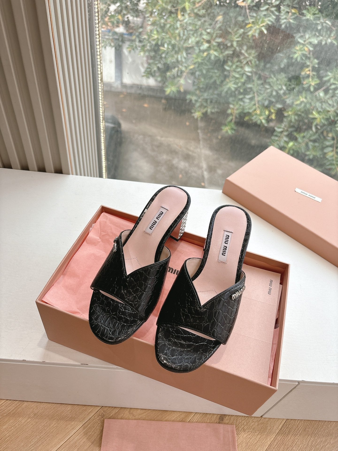 Miu Miu Black Croc Embossed Slide Sandals with Embellished Heel 223920