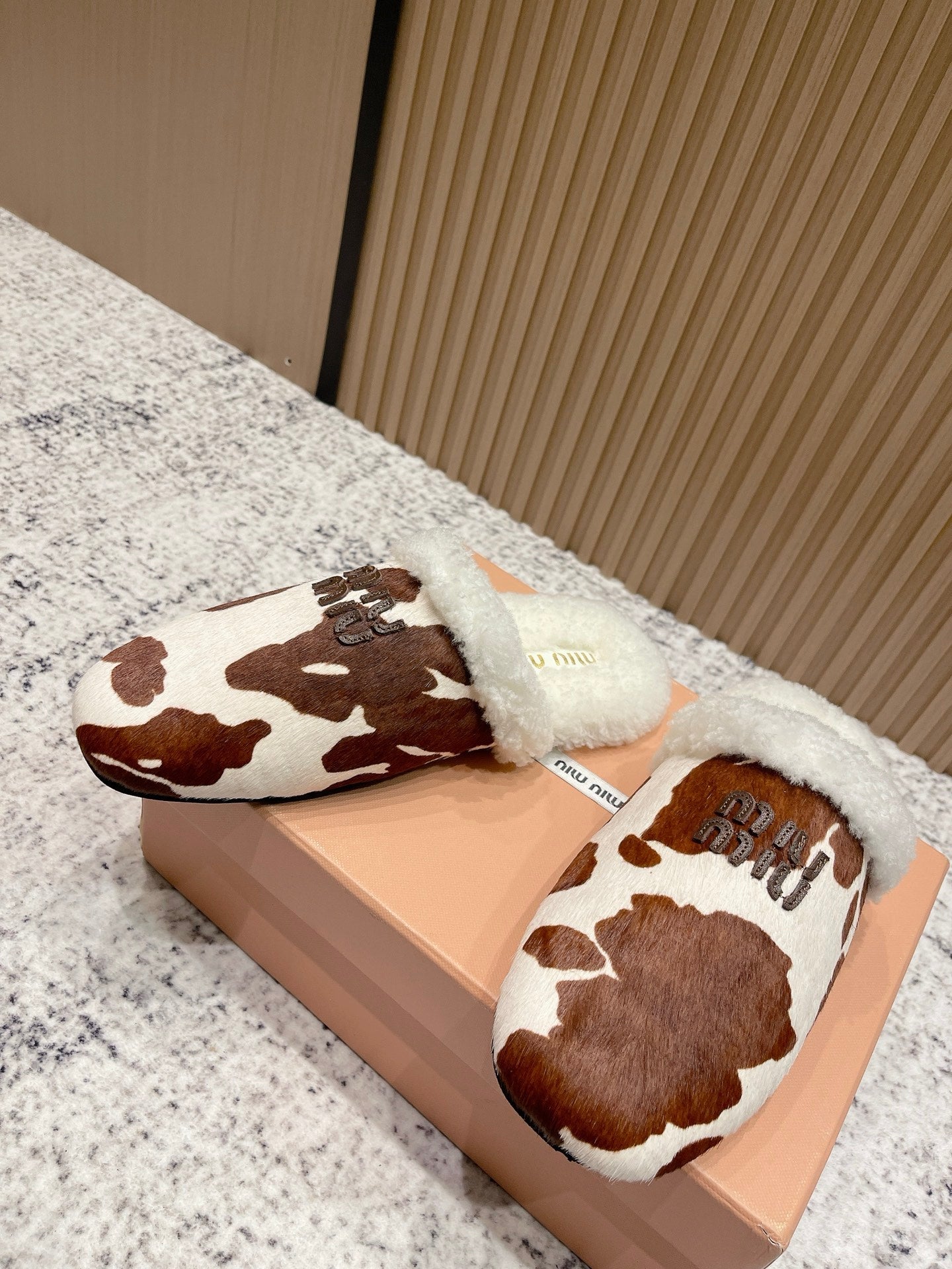 Miu Shearling-Lined Cow-Print Mules Horsehair 481434