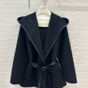 BV Hooded Leather Belt Coat in Gray Cashmere