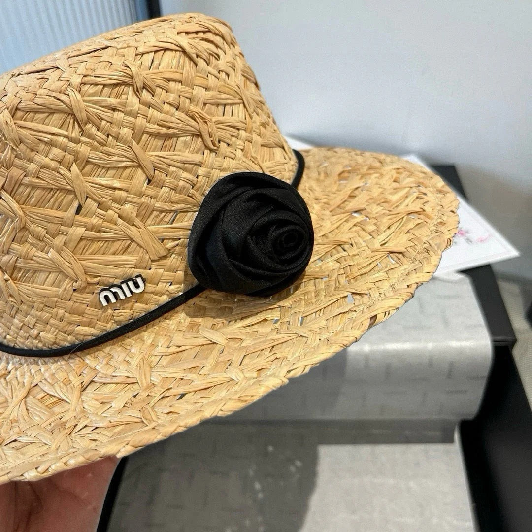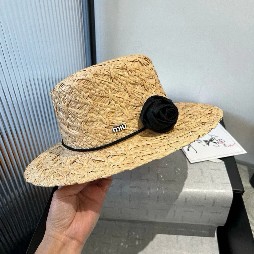 MM STRAW HAT IN BEIGE RAFFIA WITH BLACK FLOWER ACCENT
