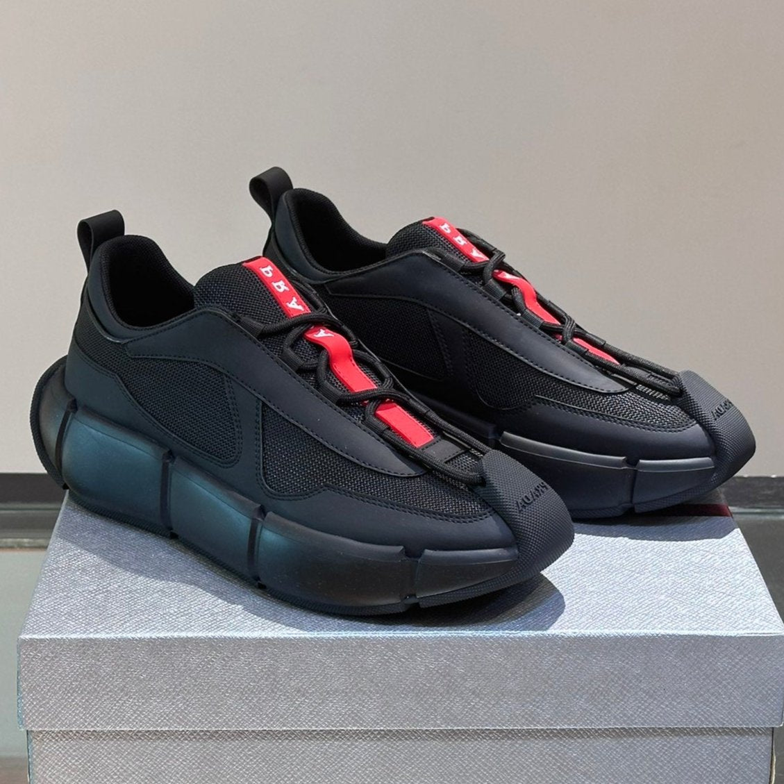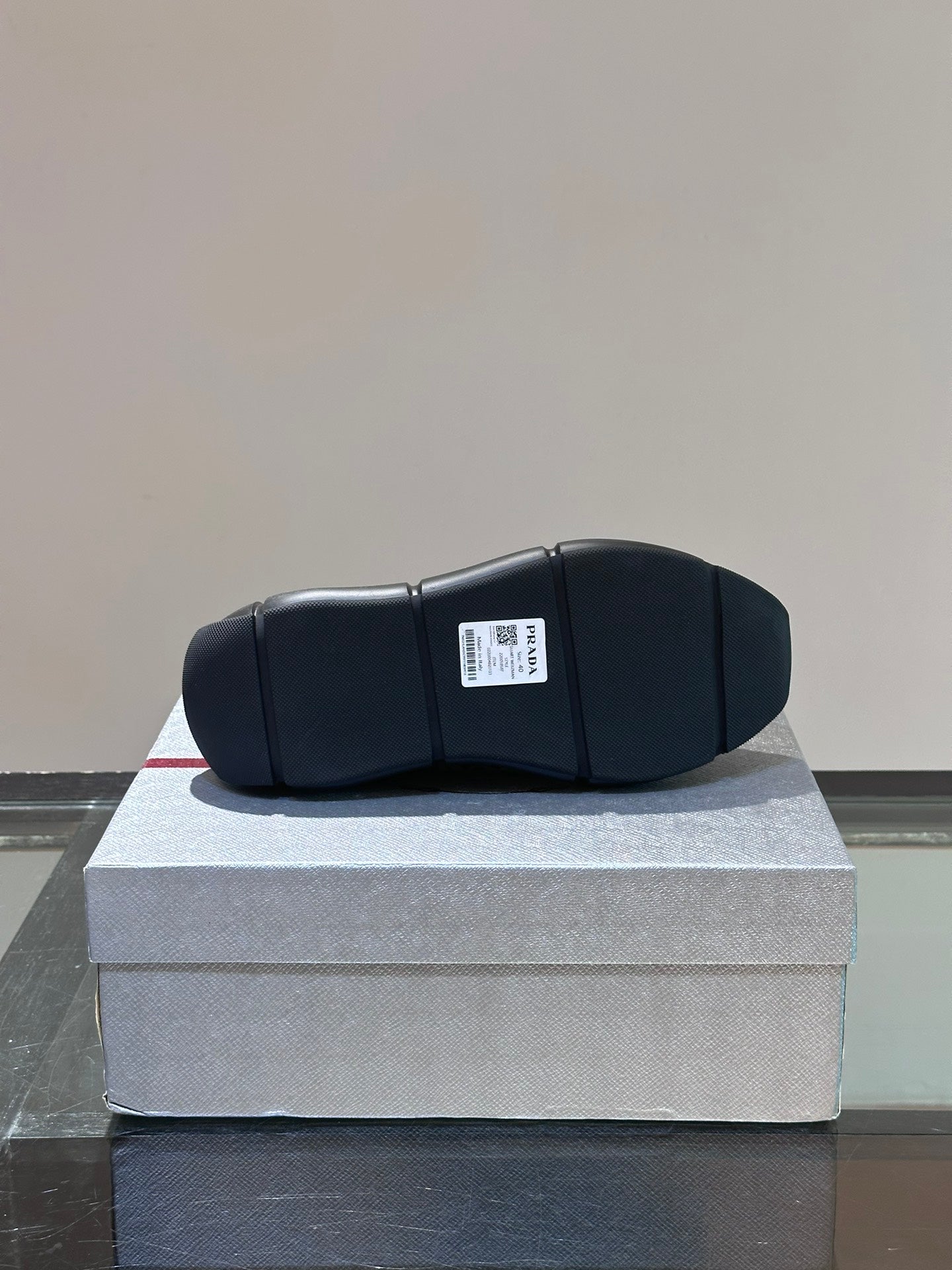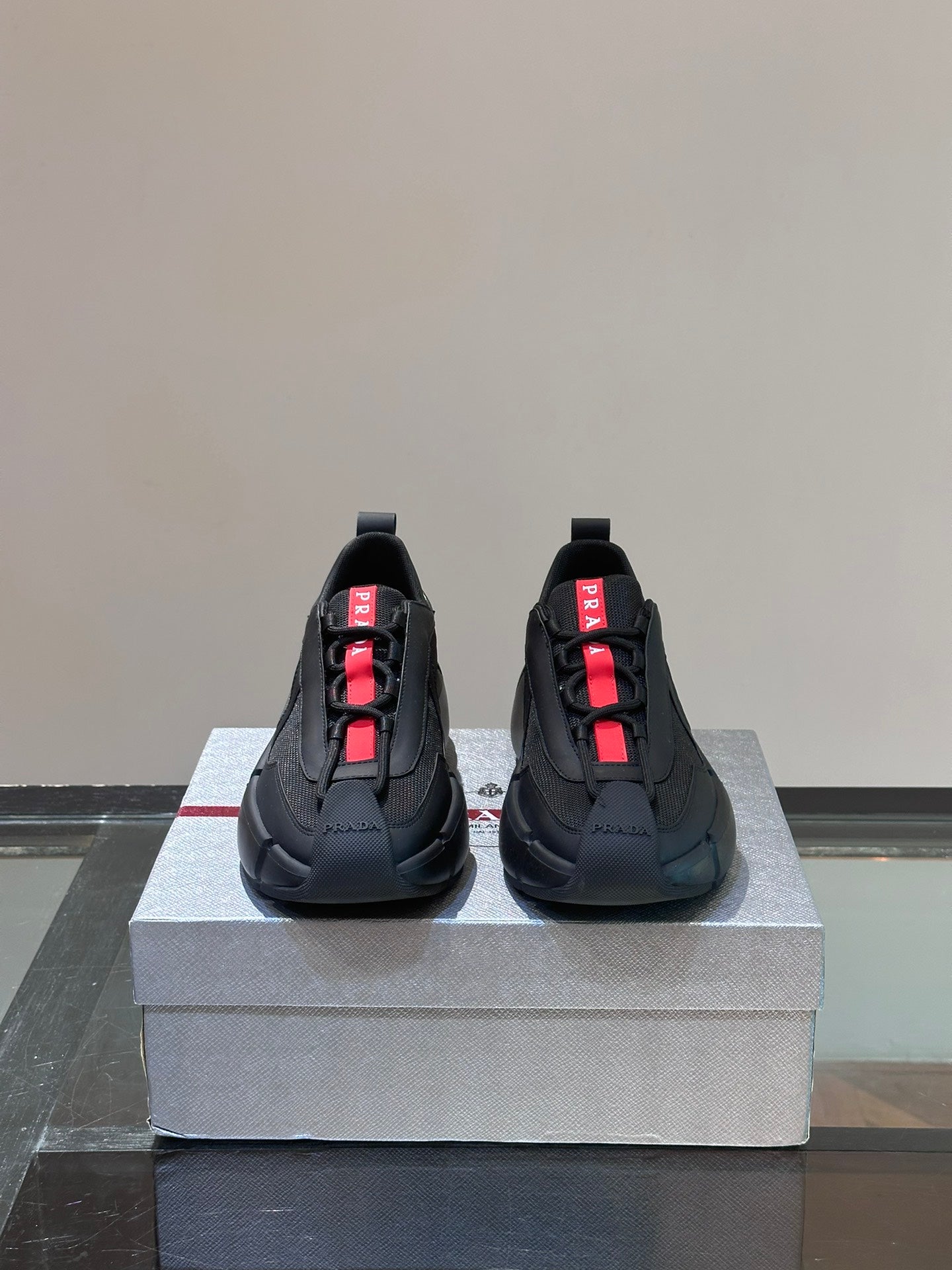 Material: Cowhide Upper with Breathable Mesh Panels, Soft and Comfortable, Breathable Tongue Decorated with PRADA Brand Letter Logo, Rubber Thick Sole with Red Tag Tongue Echo