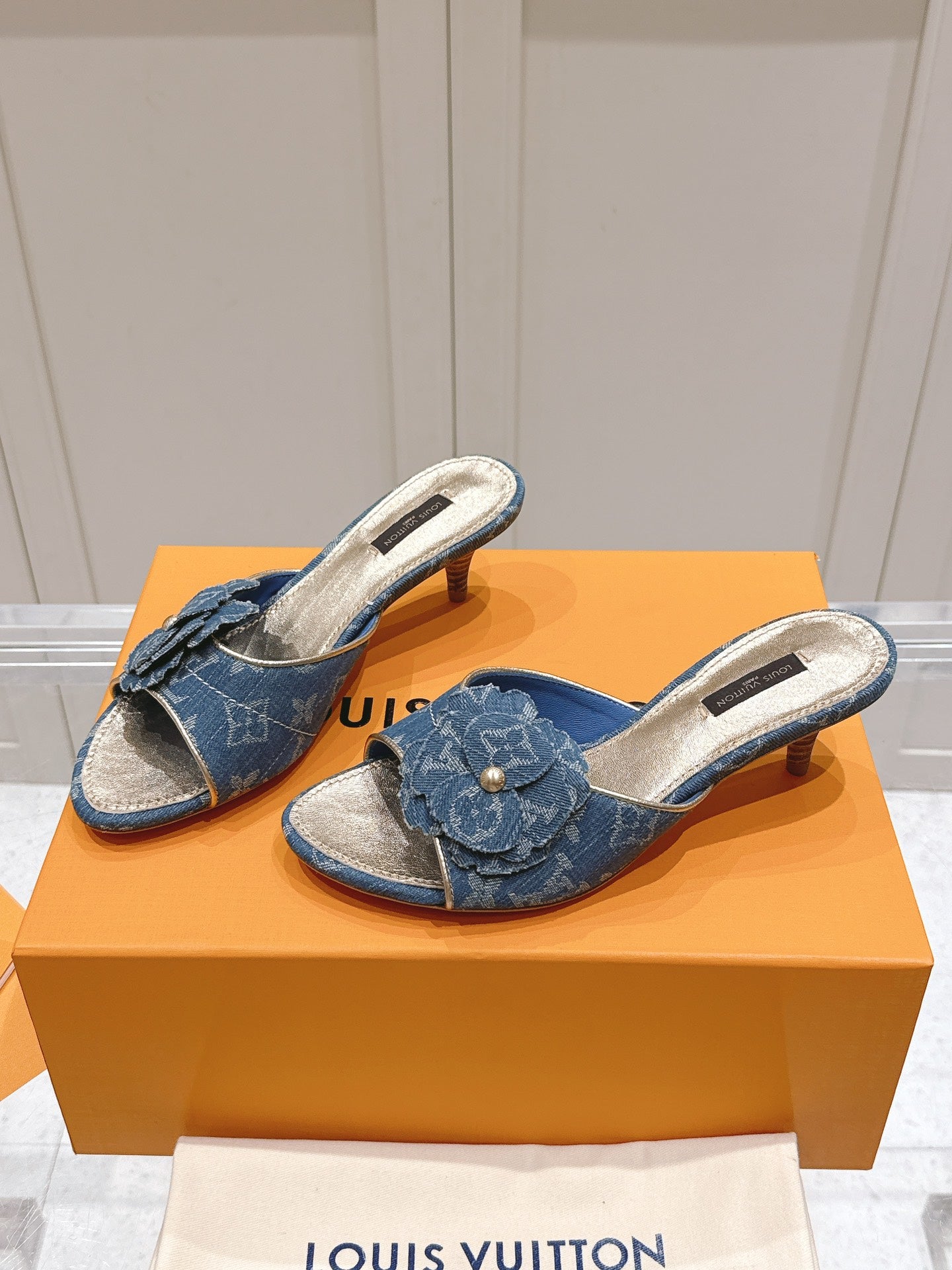 LV Floral Embroidered High Heels Blue Monogram Denim 480506