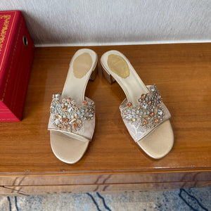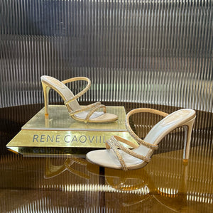 RC 25C Flower-Studded Diamond High-Heeled Sandals Beige Sheepskin 174917