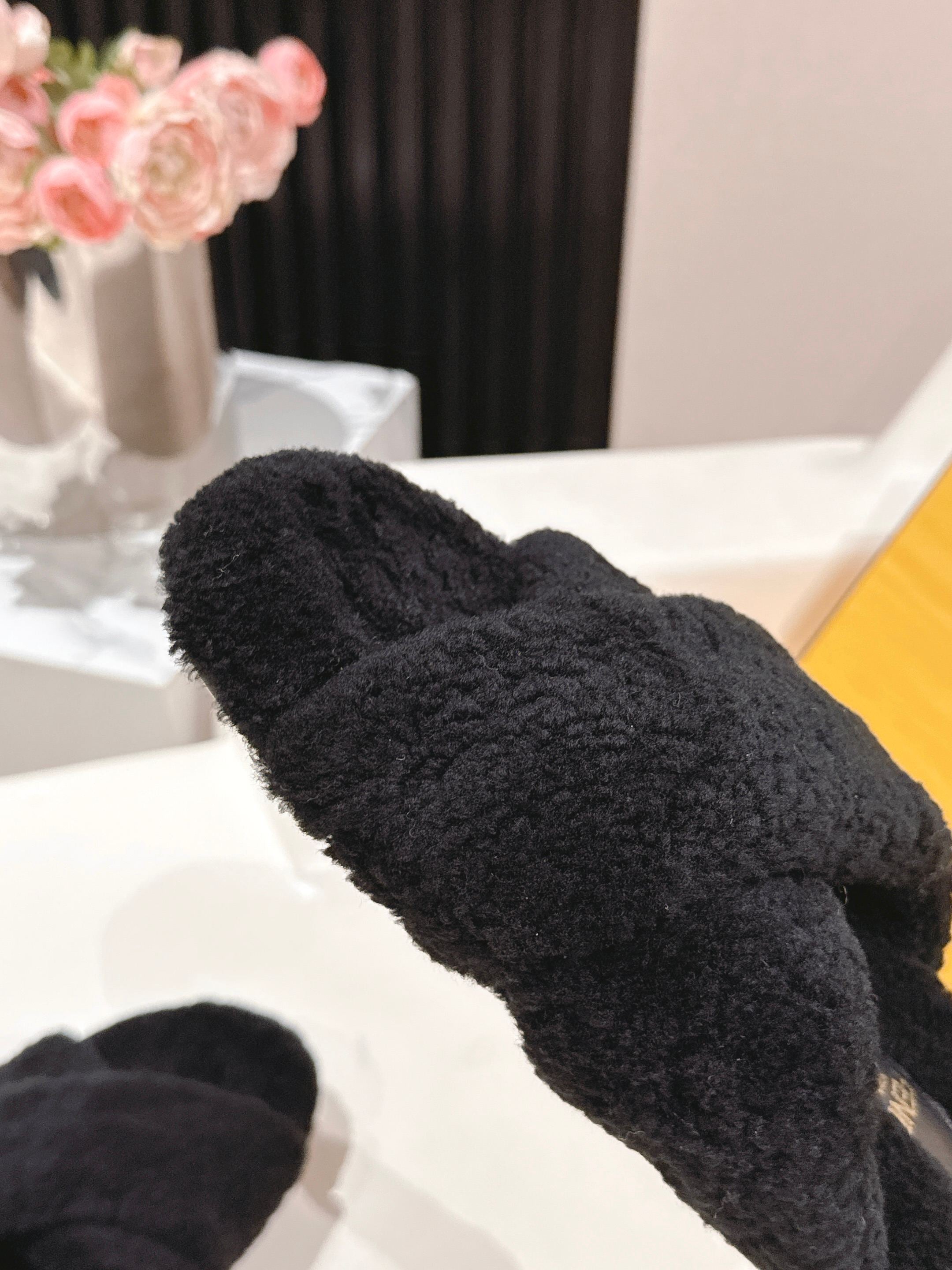 Fendi F013 2025ss Fluffy Slippers Black Lambswool 467194