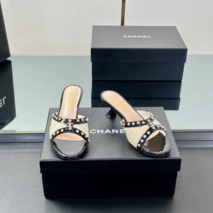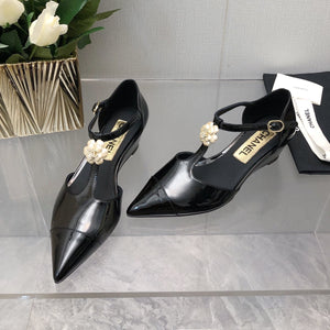 CC THONG SANDAL IN BLACK LAMBSKIN WITH PEARL FLOWER
