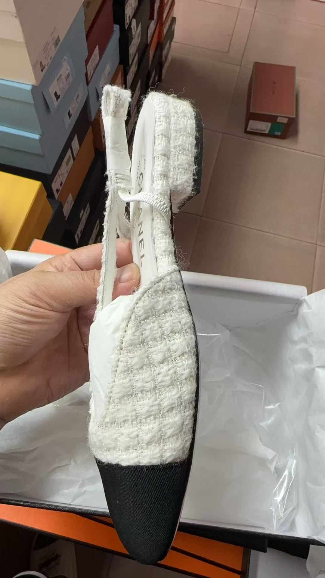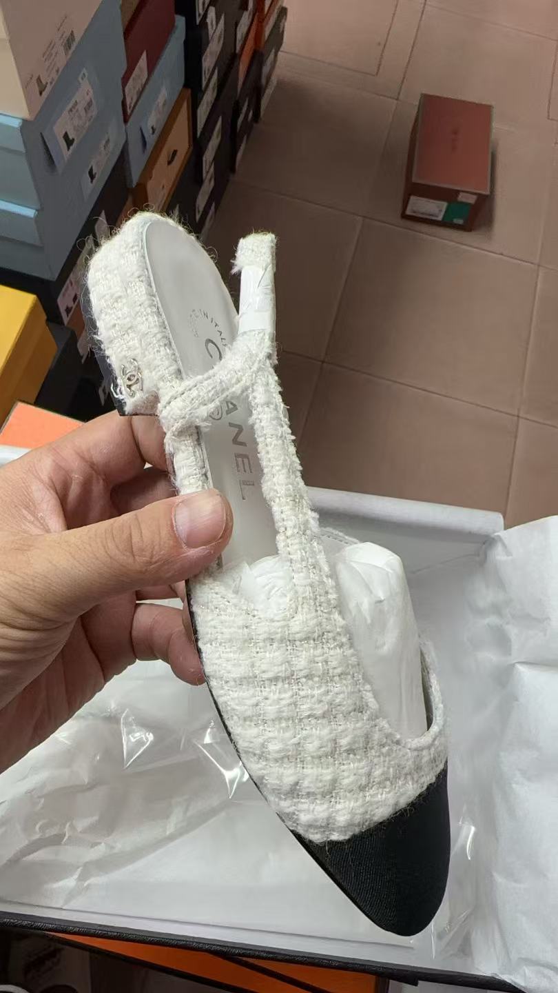 CC Cap Toe Flat Slingbacks White Black Tweed Fabric