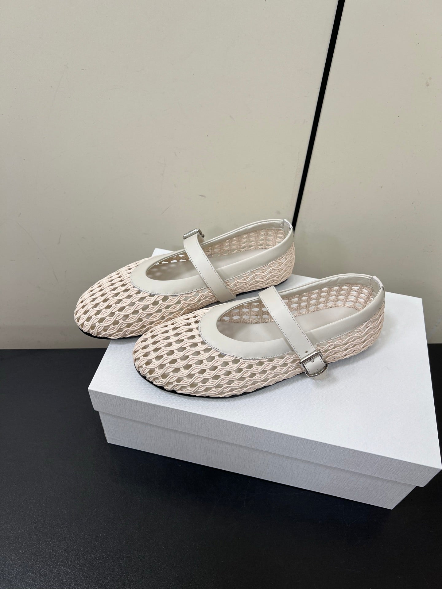 The Row 25ss Mary Jane Flat Light Pink Mesh And Grey Cowhide 340042